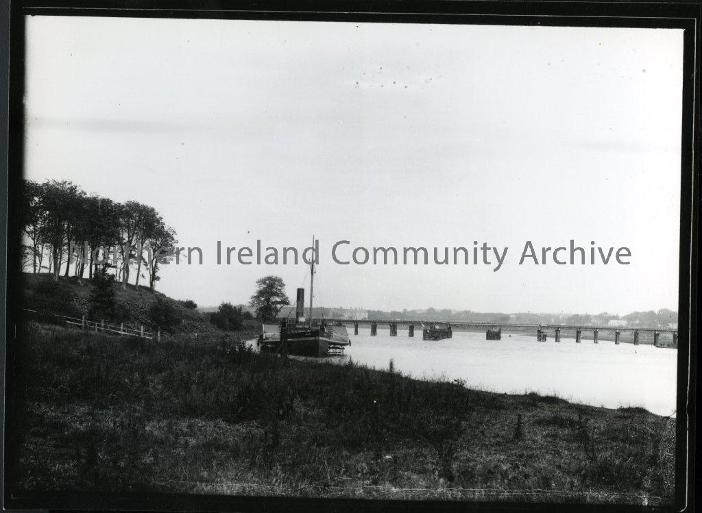 Black and white photograph view of the River Bann and train bridge, Coleraine. Paddle steamer Confidence beside County Hall Grounds with old railway bridge in the background.