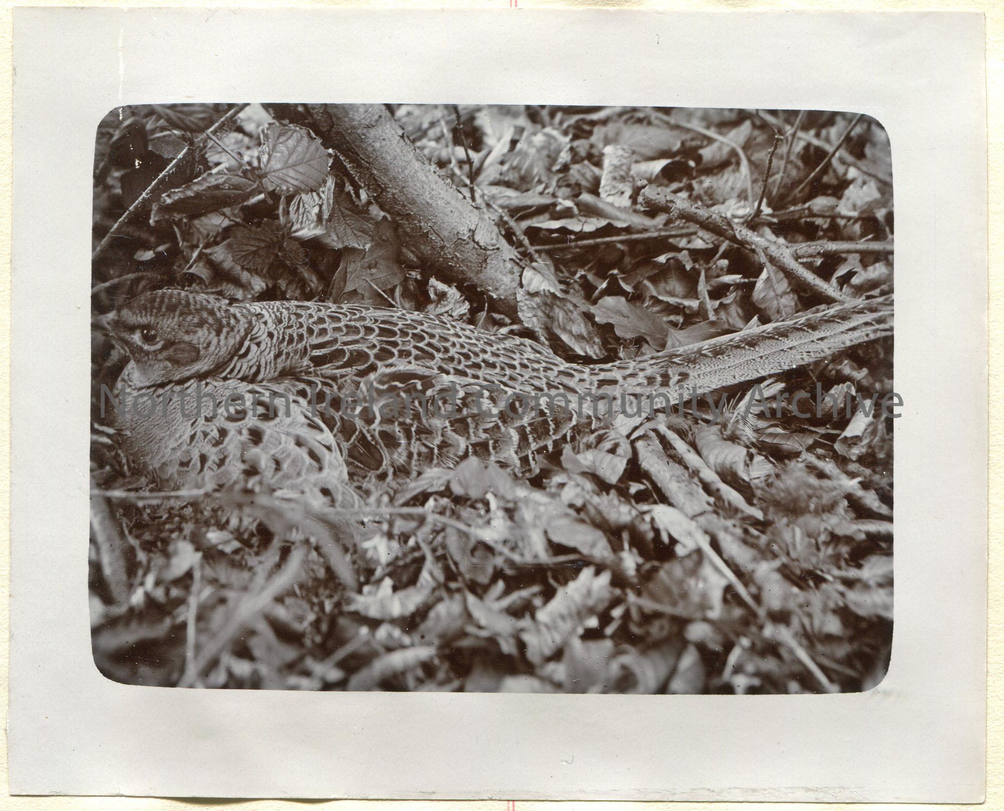 Black and white photograph with grey border. Close up image of a bird nestled among leaves.