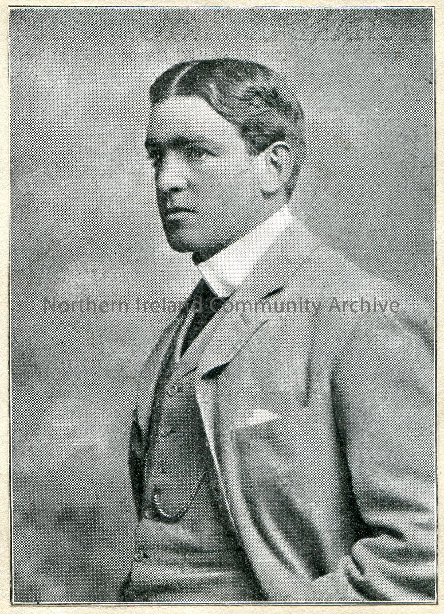Black and white photographic image, appears to be a cutting. Side view portrait image of a man. Image is captioned, ‘Sir E Shakleton [Shackleton]’.