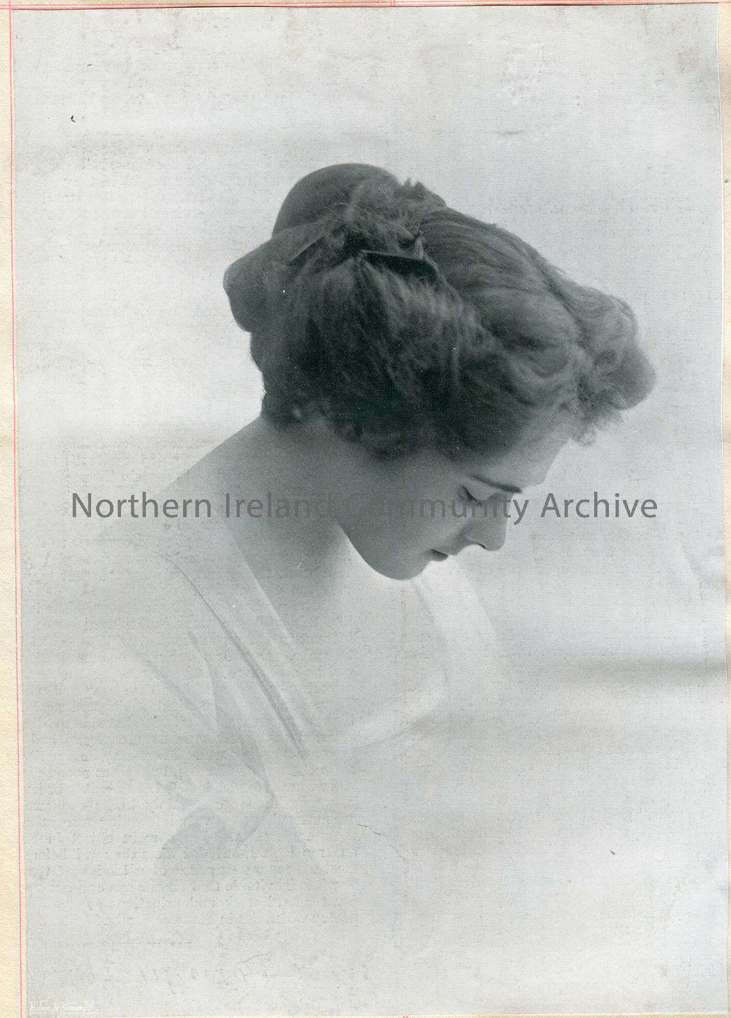 Black and white photographic image. Appears to have been cut from a magazine. Image of a woman looking downwards. Her white clothes merge with the white background. 'Hudson & Kearns Ltd' printed on bottom left corner.