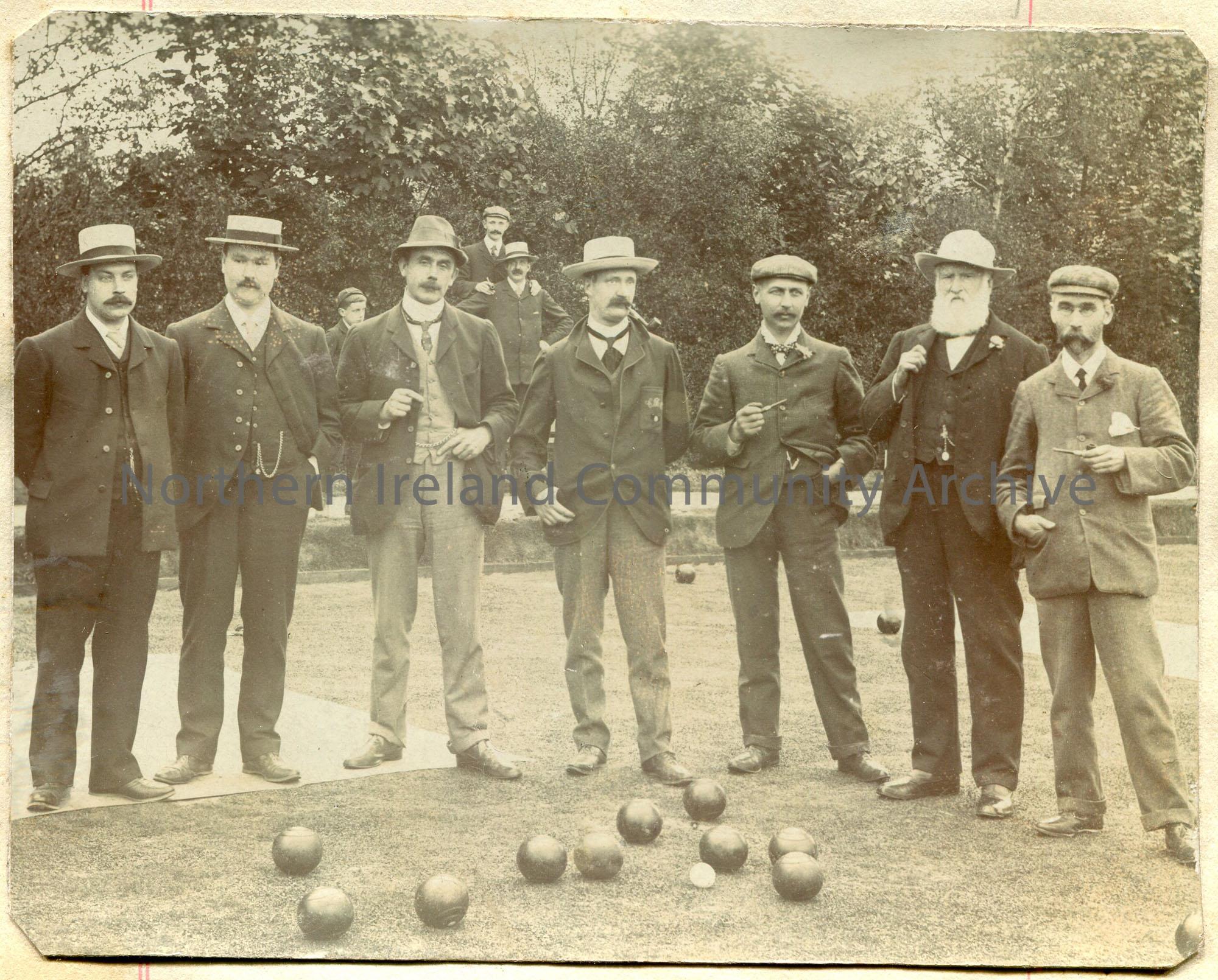 Black and white photographic image captioned, '1908 - R[?] Bowling Club'. 7 men standing on a bowling green. Second from left is Sam Henry.