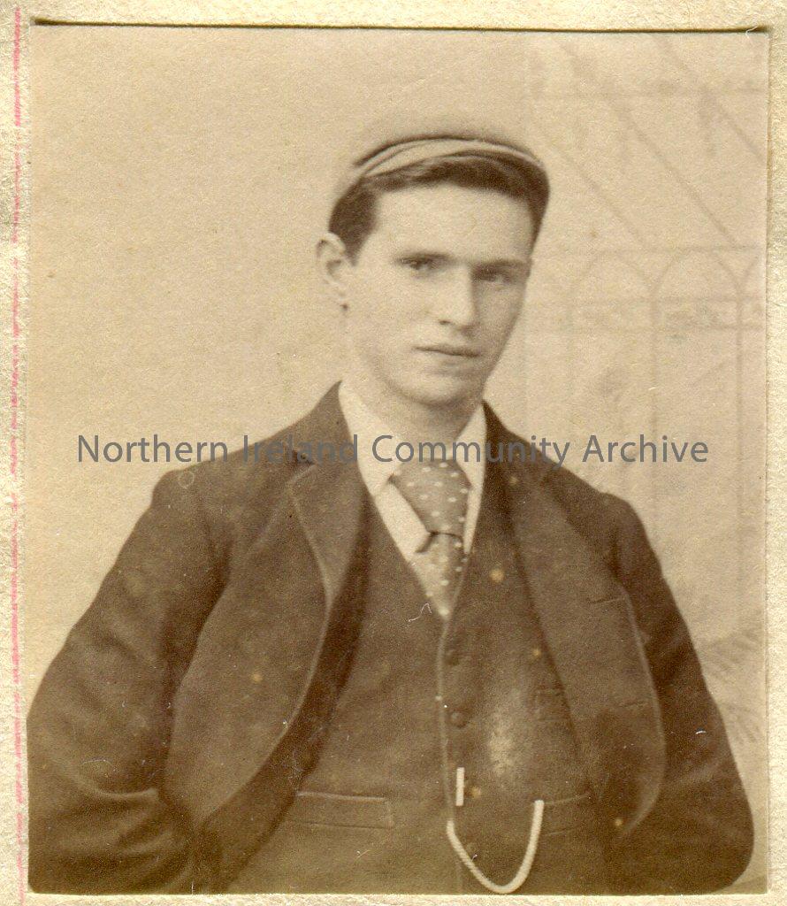 Black and white photographic image captioned, ‘F.B.H’. Portrait image of a young man wearing a hat.