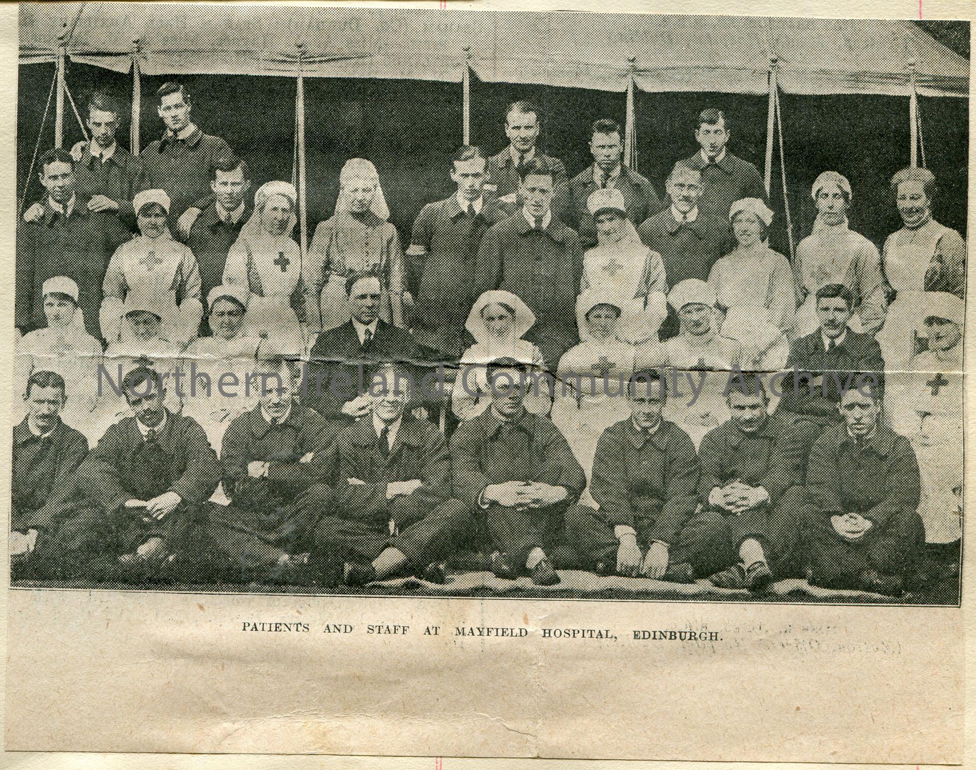 Black and white photographic image cut from a newspaper. Captioned, ‘Patients and staff at Mayfield Hospital, Edinburgh’. Features men and women. The …