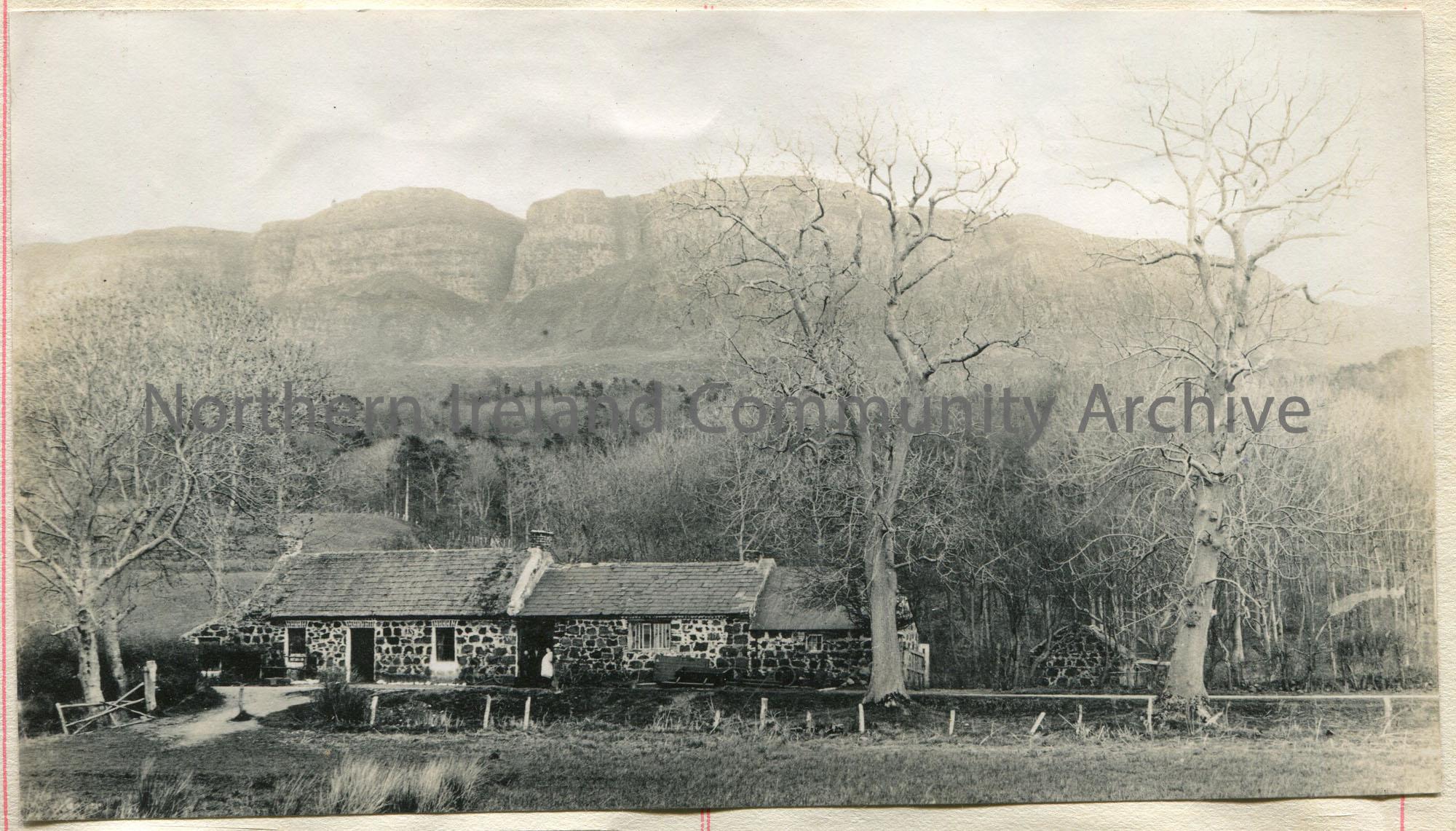 Black and white photographic image of a stone cottage and Binevenagh mountain in the background. 3 figures are standing in the doorway of the cottage.