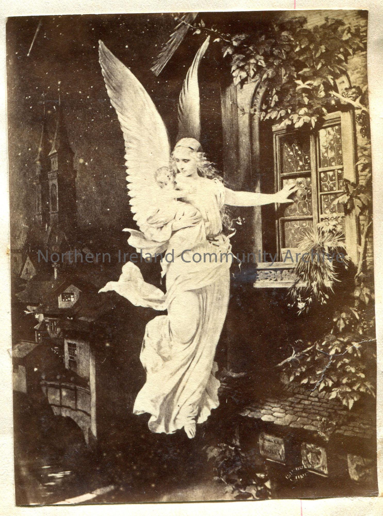 Black and white photographic image of an angel holding a baby in her arm with one arm outstretched towards a window.