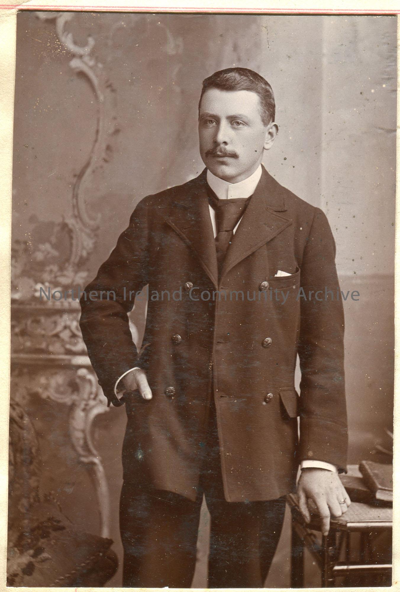 Black and white photographic image of Willie Hallett. He is standing, well-dressed, with one hand in his pocket. ‘W. Hallett’ handwritten in pencil ab…