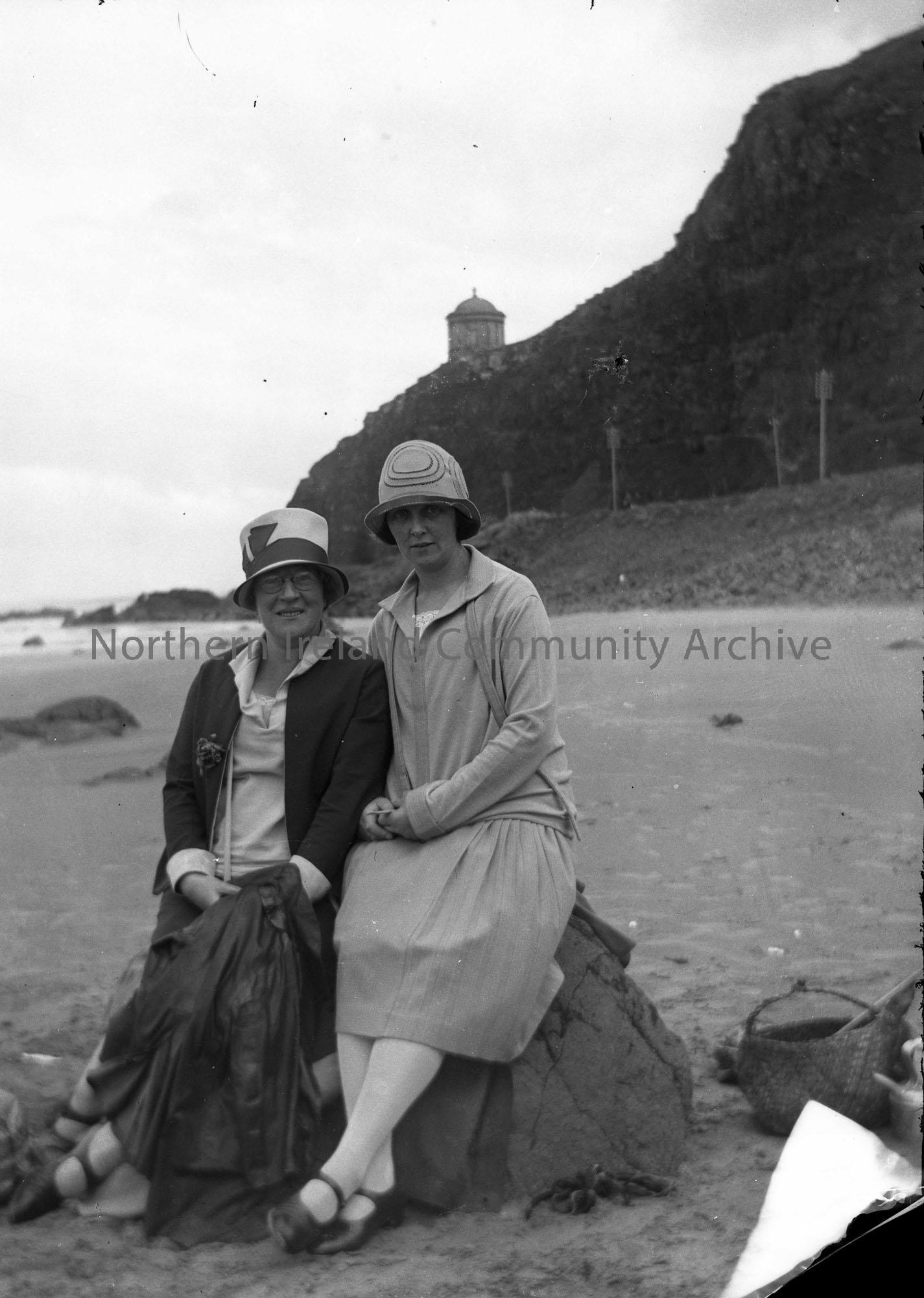 Black and white photographic image on glass plate. Features two women sitting on a rock with Mussenden Temple in the background.