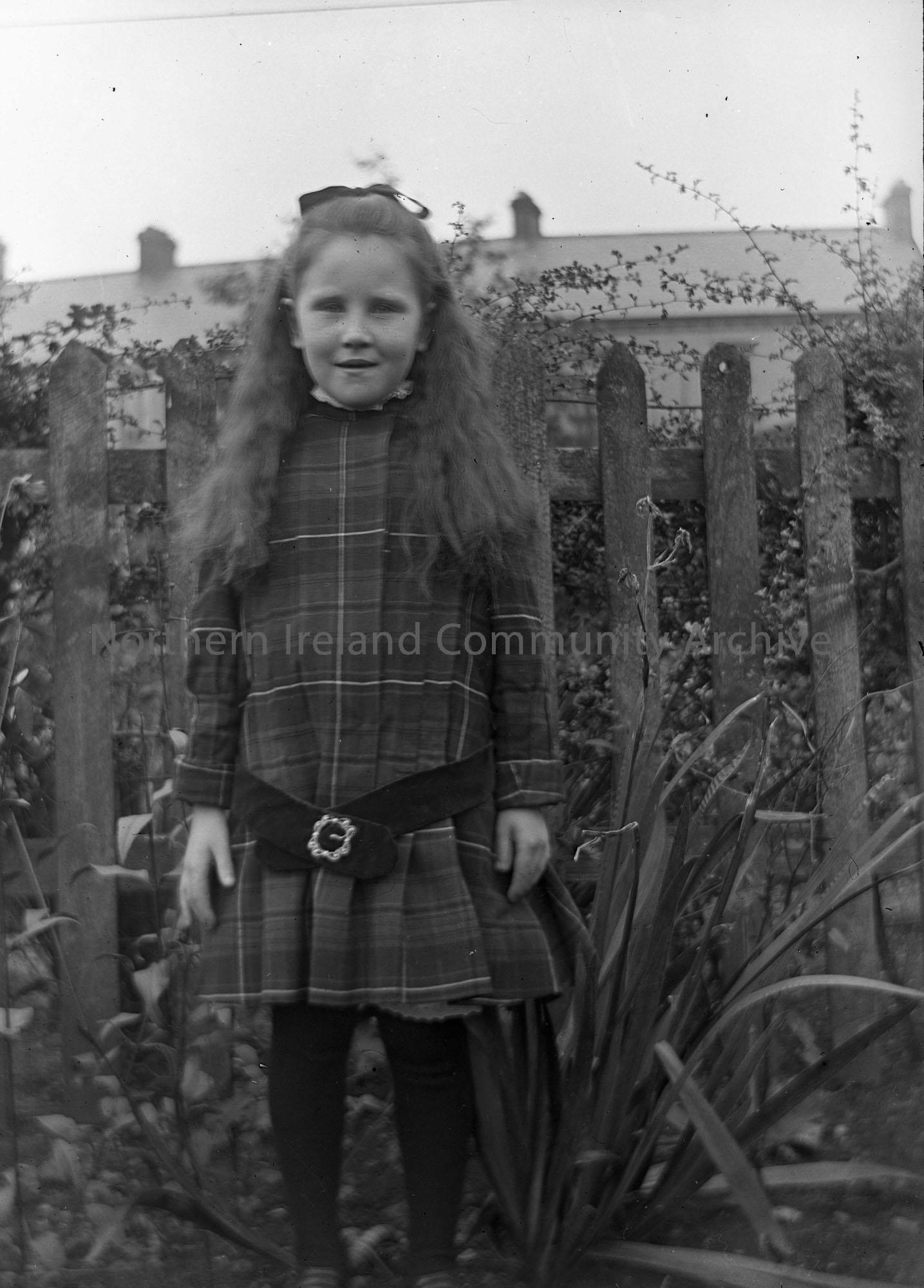 Black and white photographic image on glass plate. Numbered as 54 and titled ‘Moira’. Young girl standing in a garden wearing a check pattern dress.