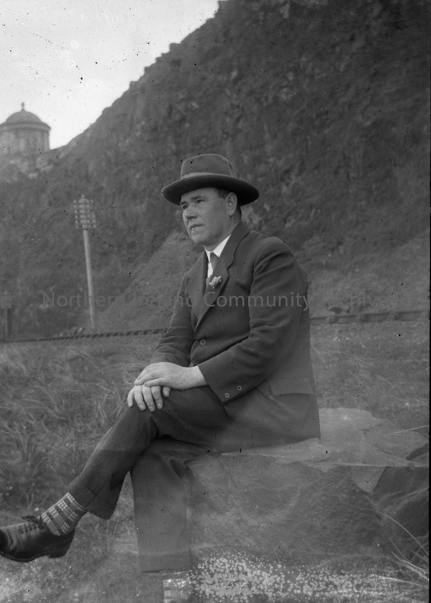 Black and white photographic image on glass plate. Numbered as 58 and titled ‘Daddy at Downhill’. Features Sam Henry sitting on a rock with Mussenden …