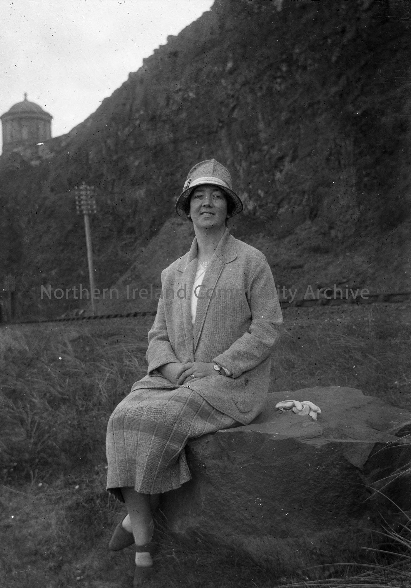 Black and white photographic image on glass plate. Numbered as 59 and titled 'Mammy at Downhill'. Features Maimie Henry sitting on a rock with Mussenden Temple in the background.