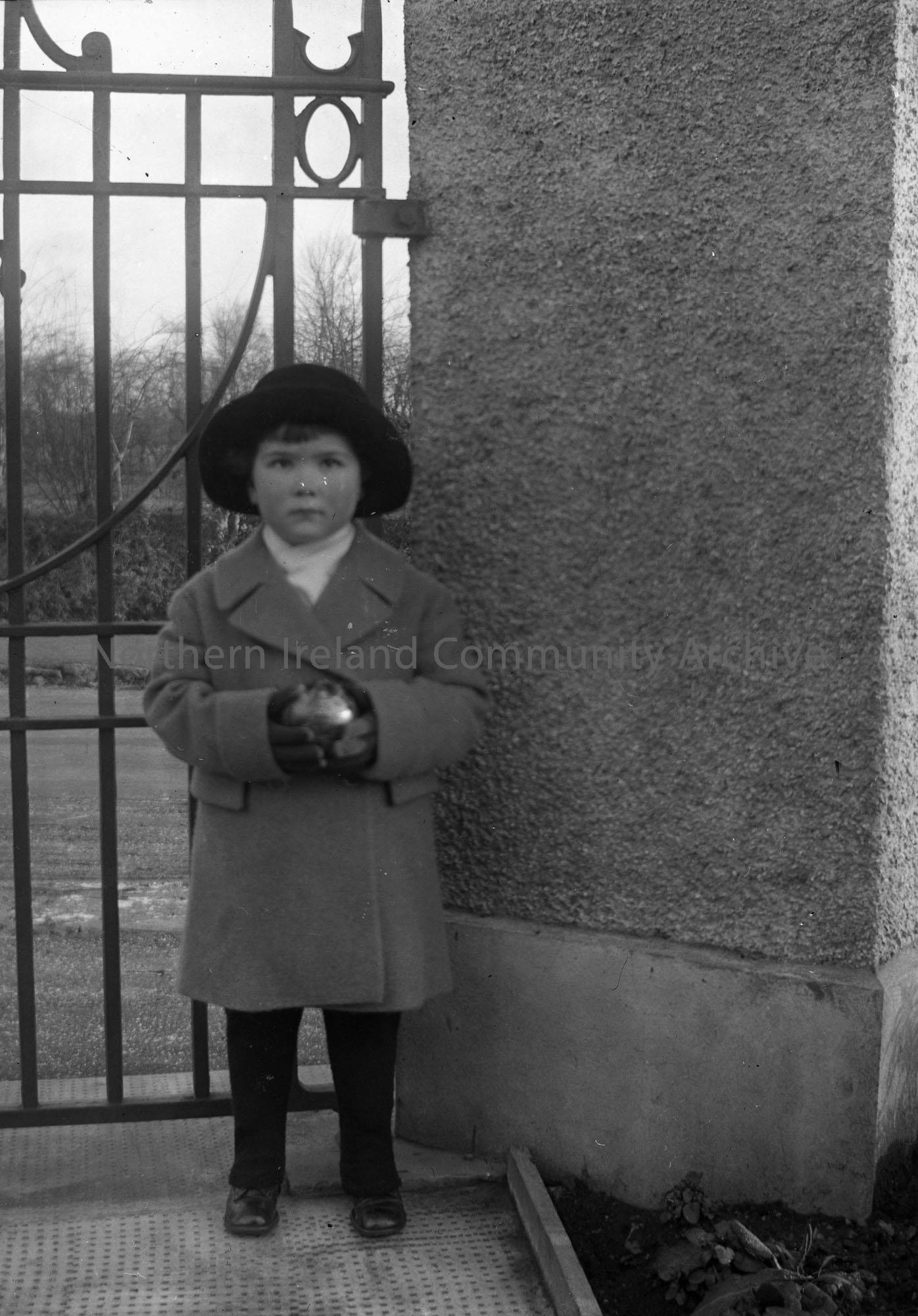 Black and white photographic image on glass plate. Numbered as No. 11 and titled, 'Olive at Sandelford Gate'. Sam Henry's daughter Olive as a small child, standing in front of a gate, holding a spherical object in her hands.
