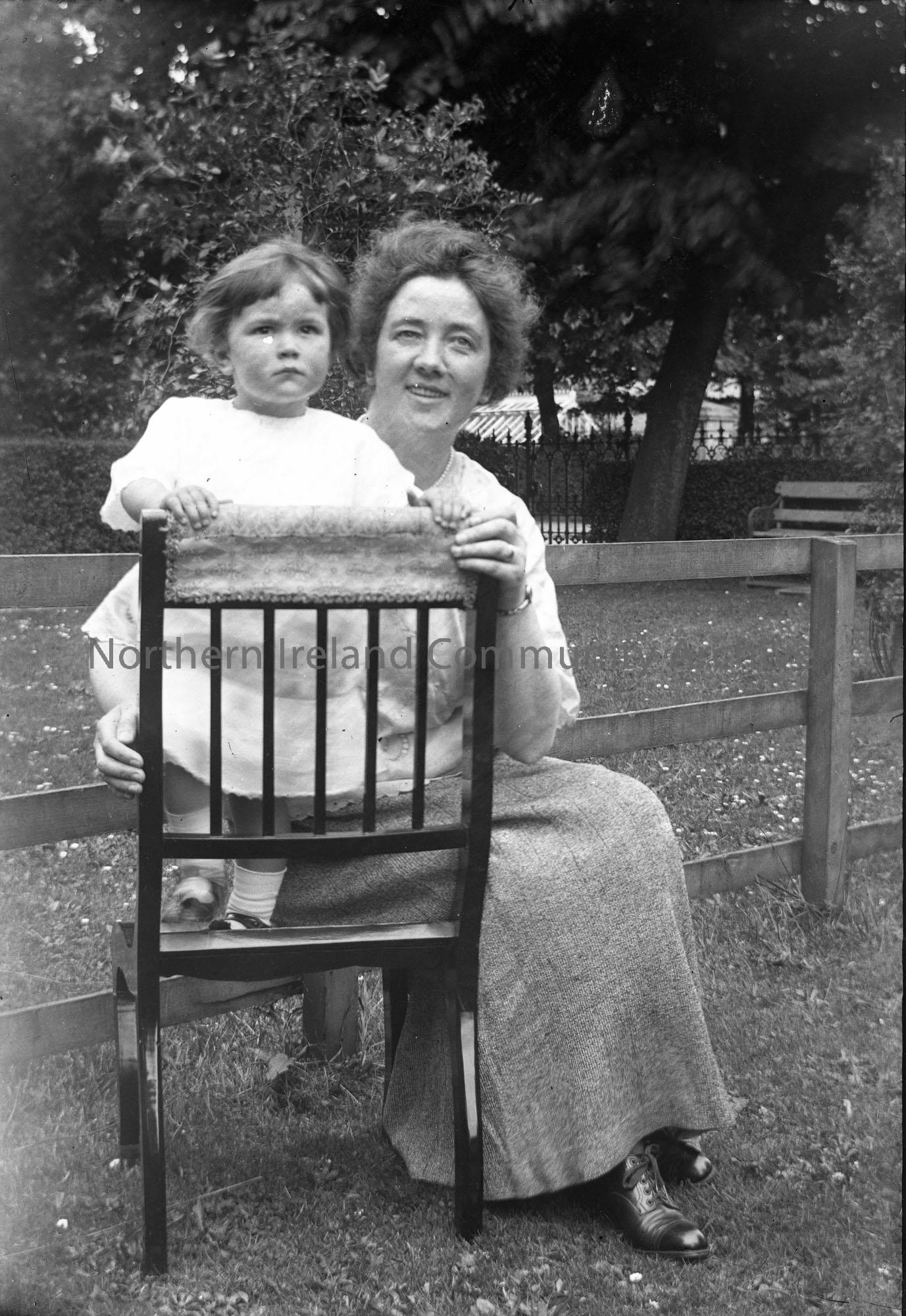 Black and white photographic image on glass plate. Numbered as No. 15 and titled, ‘Olive on chair with mammy’. Sam Henry’s daughter Olive as a small c…