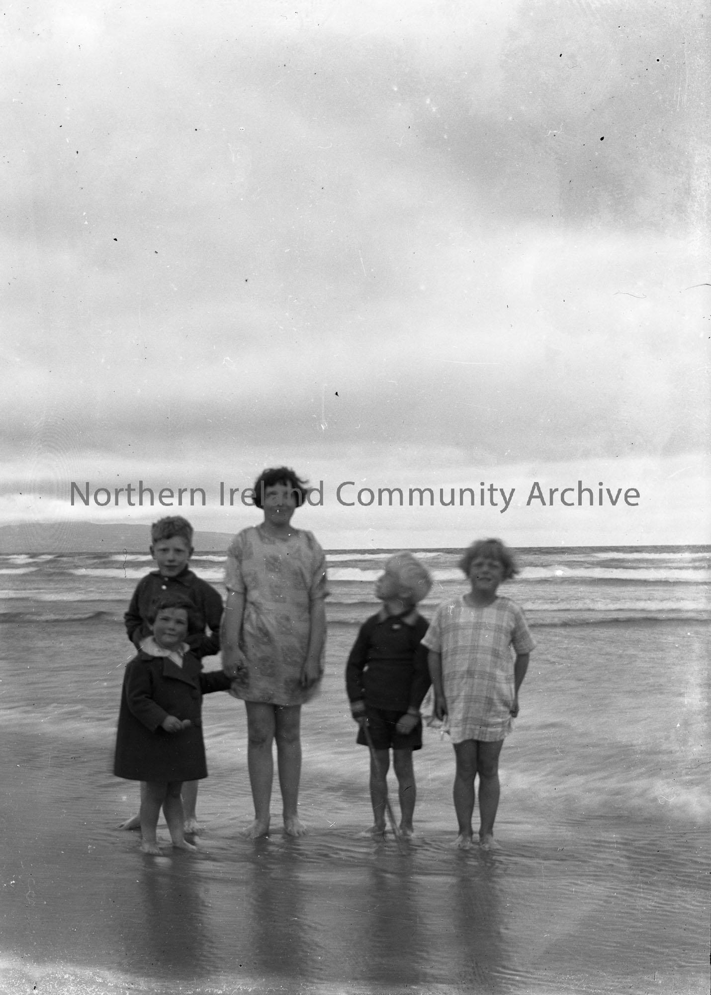 Black and white photographic image on glass plate. Numbered as No. 2 and titled, 'Olive and group at Ballintrae'. Sam Henry's daughter Olive (front left) is standing on a beach with four other children.