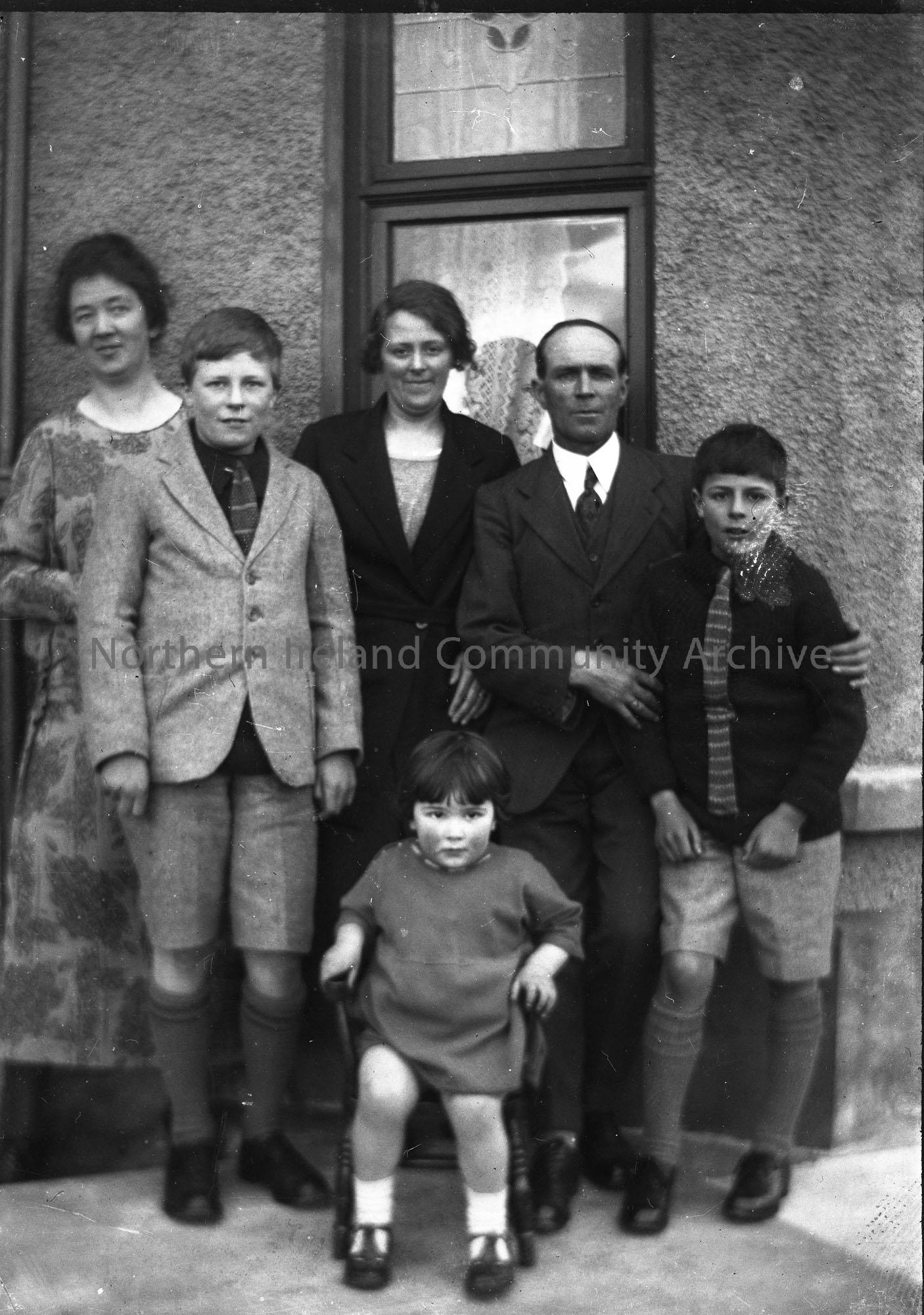 Black and white photographic image on glass plate. Numbered as No. 7 and titled, 'Olive and Plumbridges'. Sam Henry's daughter Olive sitting in a chair. Sam Henry's wife Maimie is on far left.