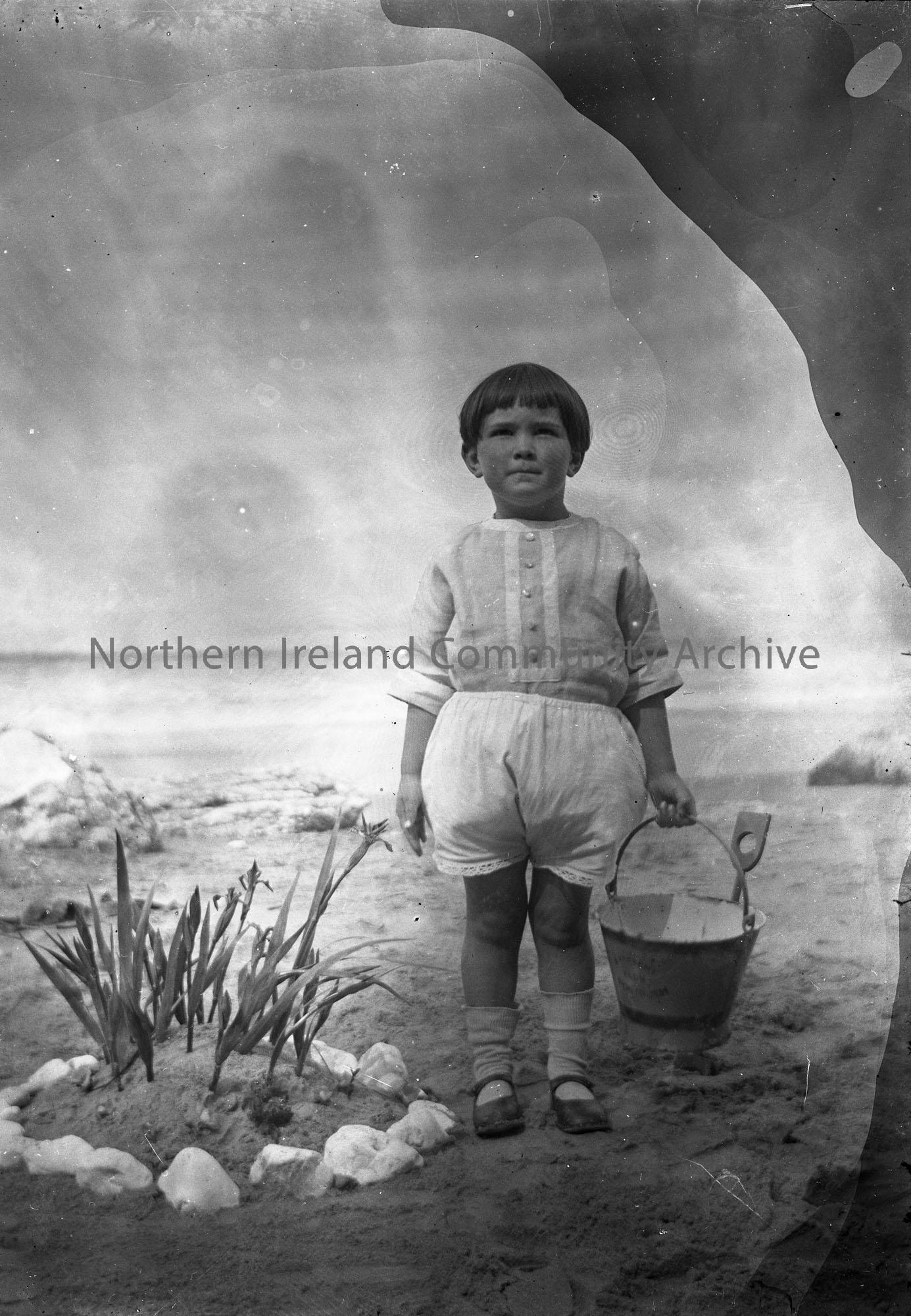 Black and white photographic image on glass plate. Numbered as No. 9 and titled, 'Olive at Whitepark'. Sam Henry's daughter Olive as a small child, standing on a beach holding a bucket and spade.