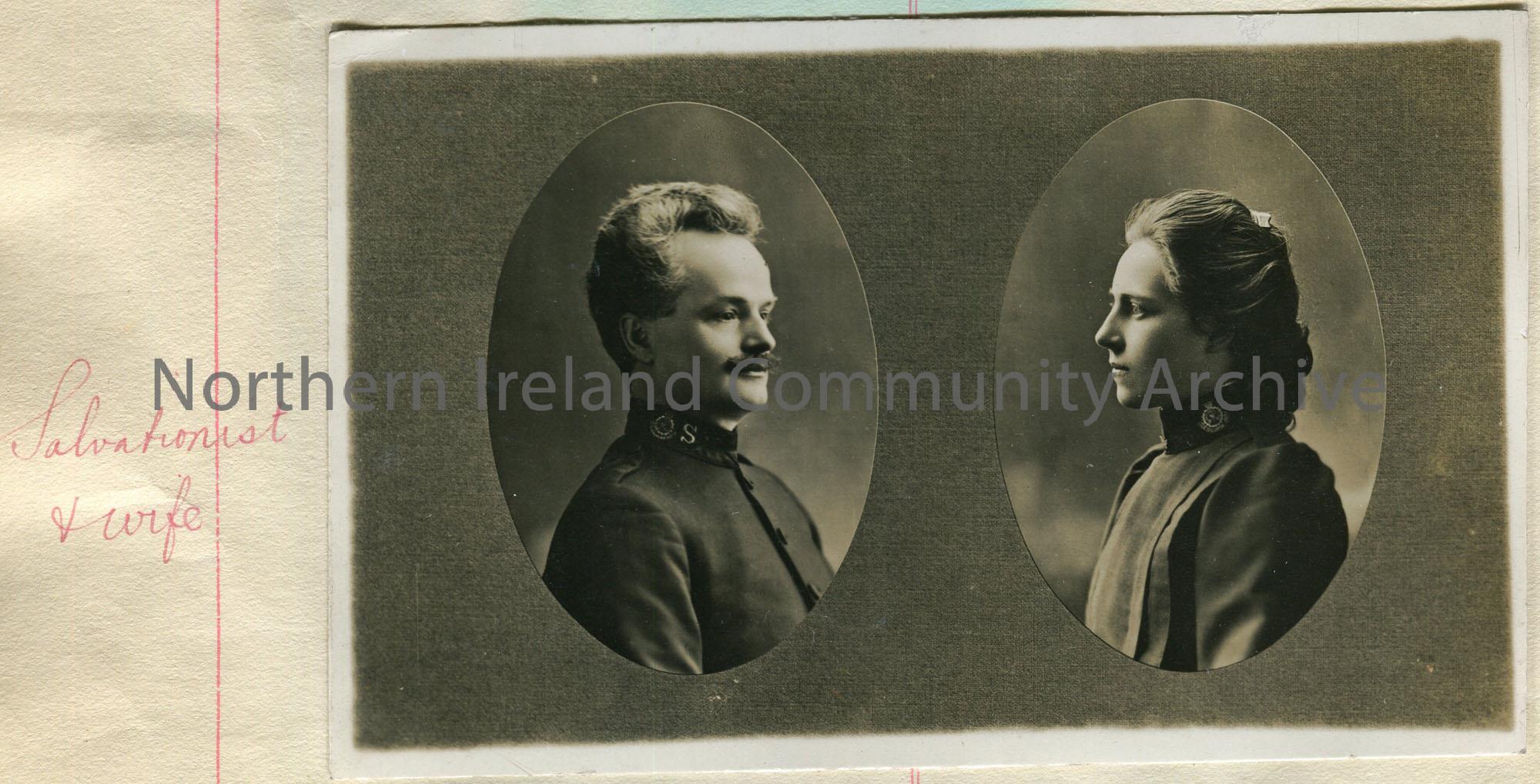 Black and white photographic portrait image of a man and a woman wearing Salvation Army uniforms. Captioned, ‘Salvationist & wife’.