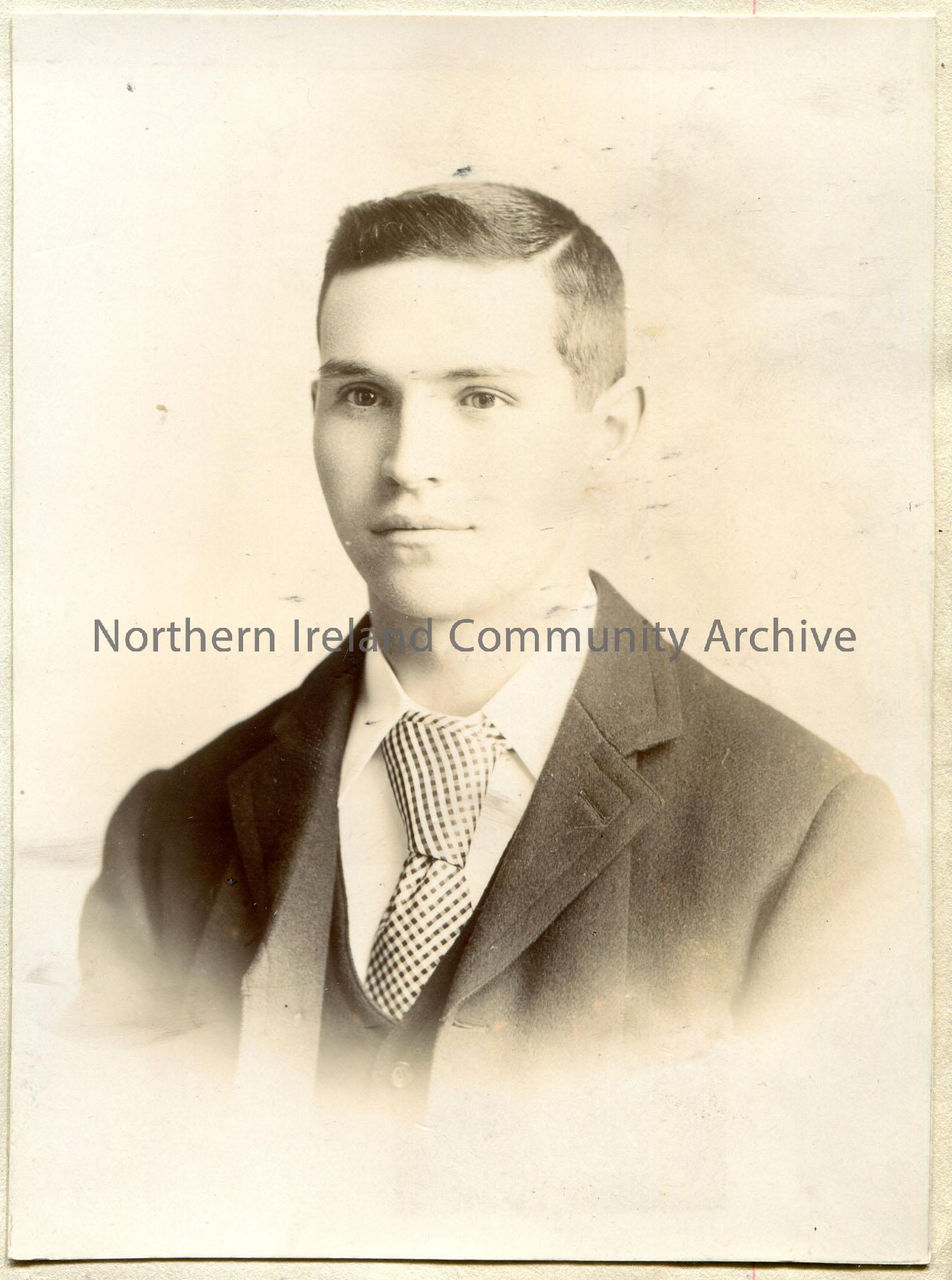 Black and white photographic portrait image of a young man in a suit and tie. ‘J.B.Henry. Oct 19’ handwritten in pencil below image.