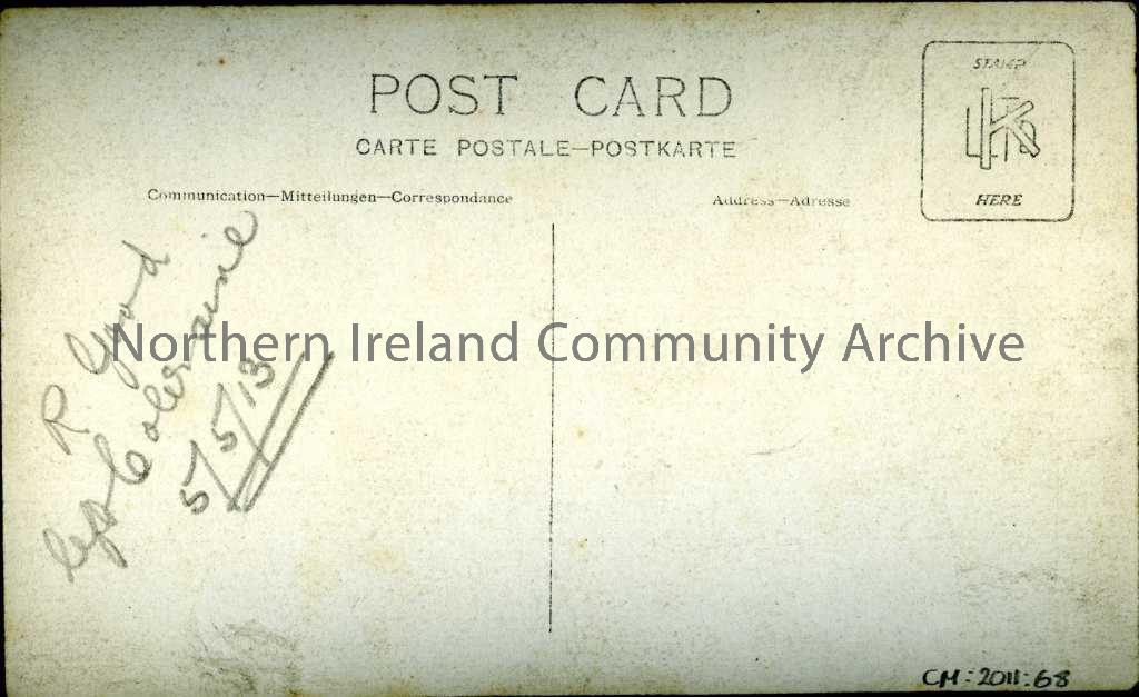 Black and white photographic postcard of 3 men in front of a garden gazebo. The two on the right side are smoking. On the back is written 'R.Good left Coleraine 5/5/1913' in pencil.