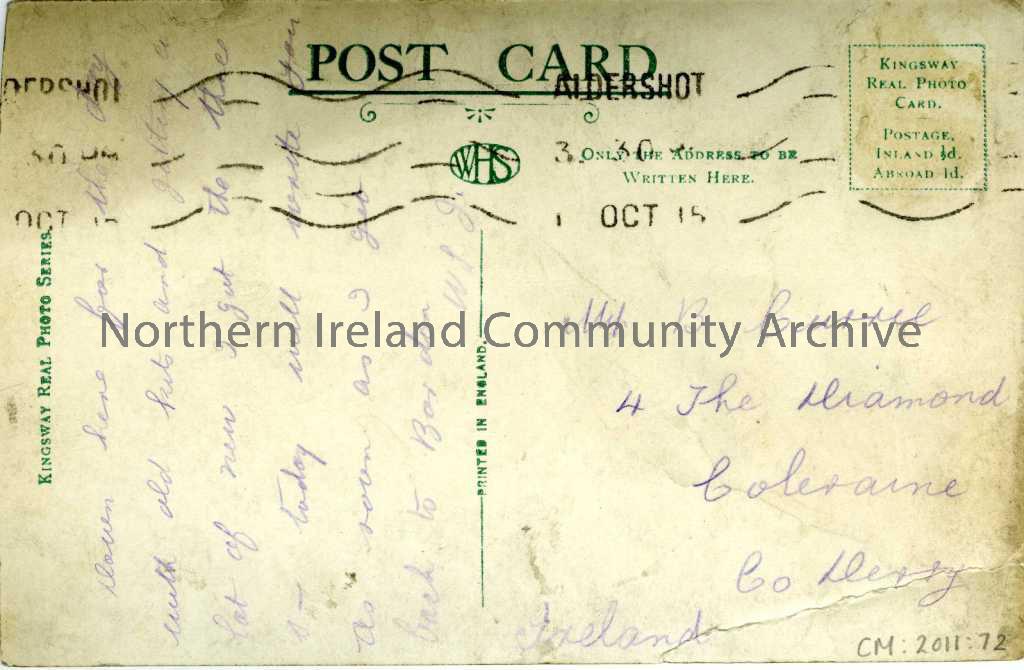 Black and white photographic postcard titled 'Queen's Avenue, looking towards North Camp, Aldershot.' Addressed to Mis B Currie, 4 The Diamond, Coleraine. Dated Oct 1915.