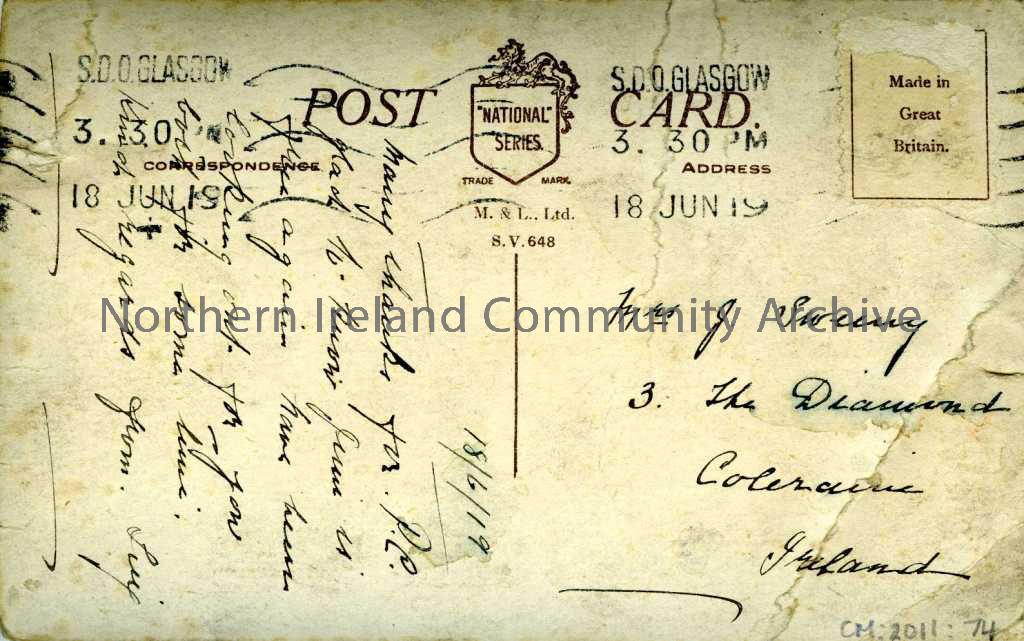 Black and white photographic postcard titled ‘Steamers leaving Bridge Wharf, Broomielaw, Glasgow.’ Addressed to Mrs J Sweeney, 3 The Diamond, Colerain… – 0024