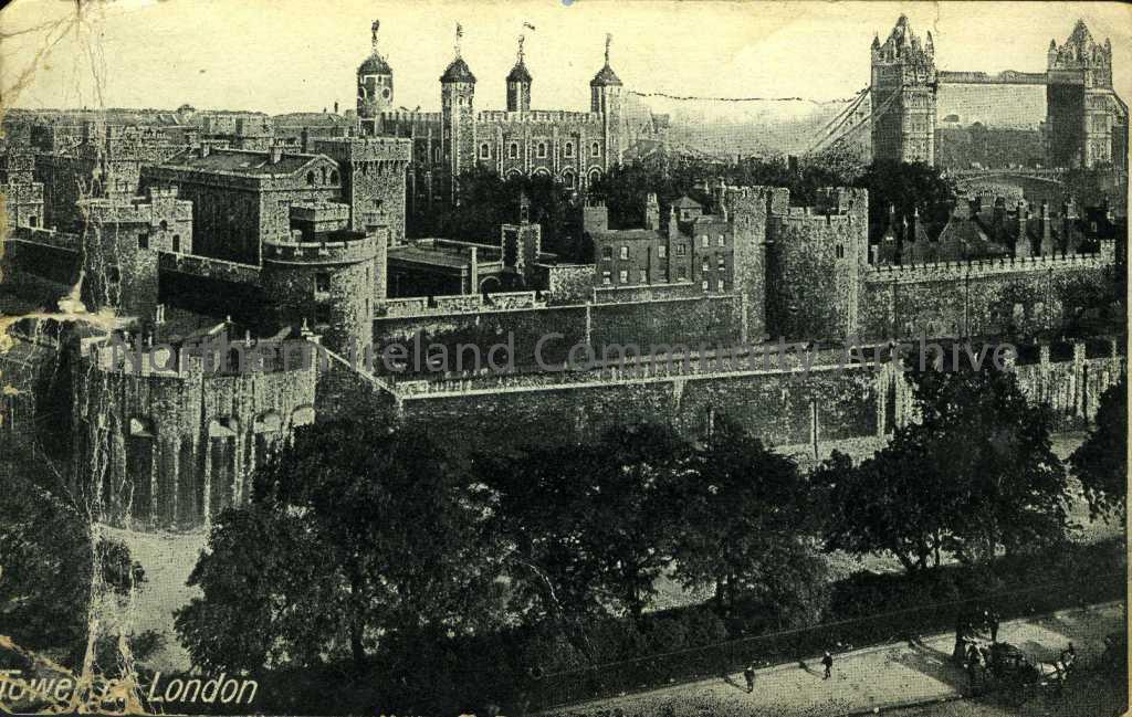 Black and white photographic postcard titled ‘Tower of London’. Addressed to Miss B Currie, 79 Kansas Ave, Belfast. Dated 15th September ?