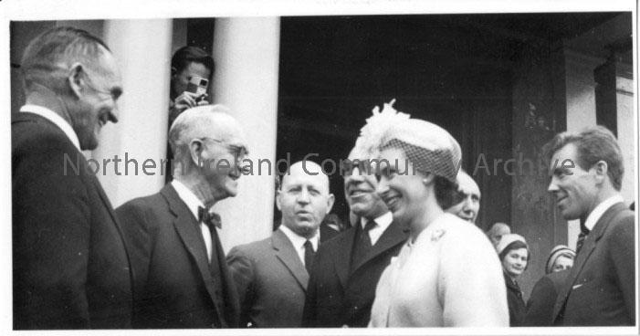 Black and white photographs taken on the occasion of the visit of H.R.H The Princess Margaret, Countess of Snowdon, and The Earl of Snowdon on Thursday, June 6th, 1963. Photographs include Princess Margaret signing the visitors book and Princess Margaret shaking hands with Councillor Mollie Holmes. The largest photograph shows the Governor of R.J Lord Wekehurst chatting to H.R.H. Princess Margaret countess of Snowdon & Lord Snowdon. Also included in the photograph is Mrs Campbell, wife of Chairman of Urban Council, Councillor Mrs Mollie Holmes, Councillr Joseph P. Owens, Councillor William McCoubrey and Councillor J.V.McClenaghan.