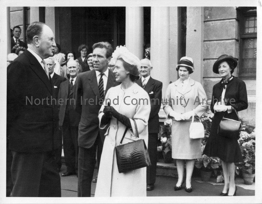 Black and white photographs taken on the occasion of the visit of H.R.H The Princess Margaret, Countess of Snowdon, and The Earl of Snowdon on Thursday, June 6th, 1963. Photographs include Princess Margaret signing the visitors book and Princess Margaret shaking hands with Councillor Mollie Holmes. The largest photograph shows the Governor of R.J Lord Wekehurst chatting to H.R.H. Princess Margaret countess of Snowdon & Lord Snowdon. Also included in the photograph is Mrs Campbell, wife of Chairman of Urban Council, Councillor Mrs Mollie Holmes, Councillr Joseph P. Owens, Councillor William McCoubrey and Councillor J.V.McClenaghan.