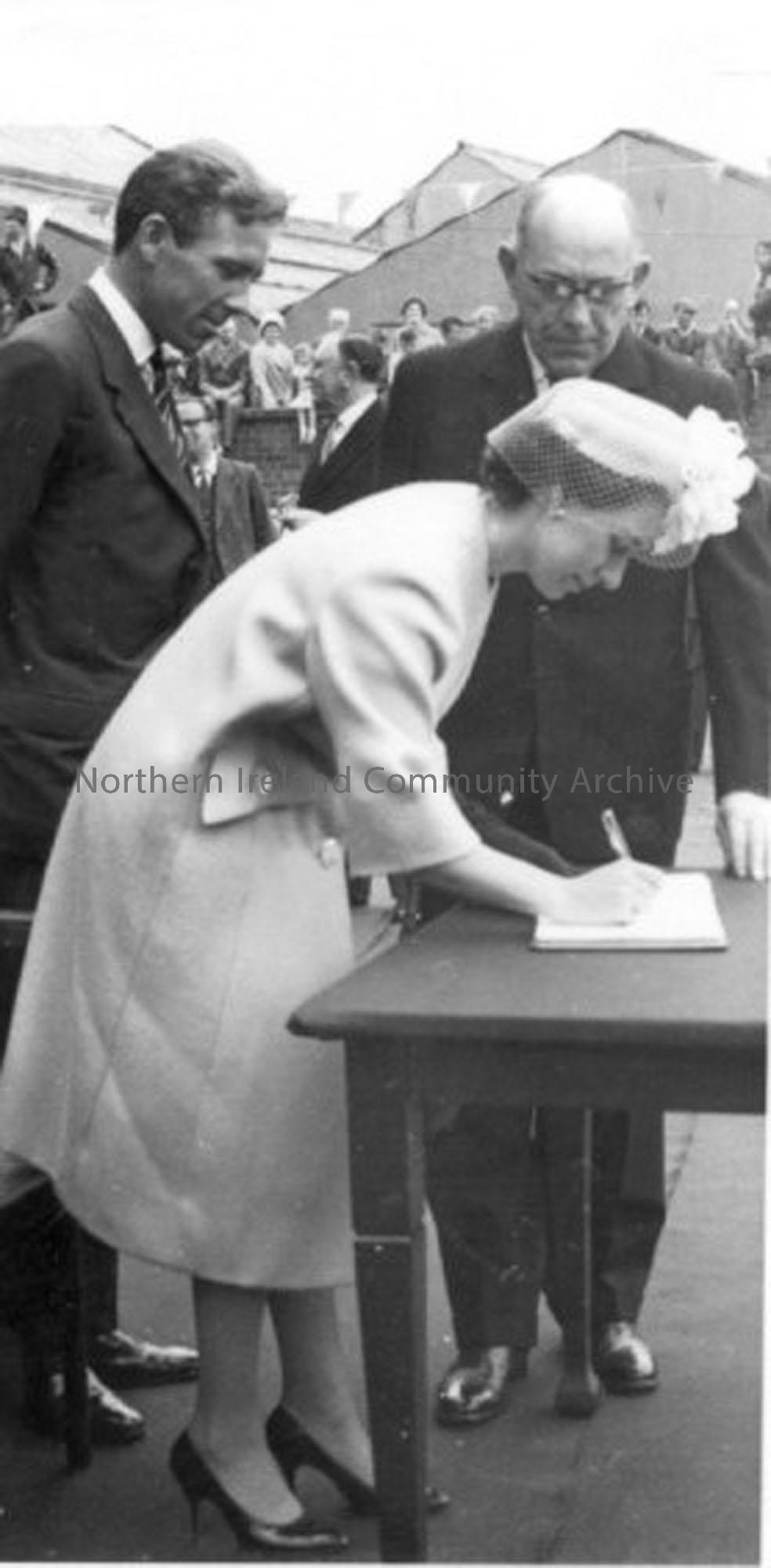 Black and white photographs taken on the occasion of the visit of H.R.H The Princess Margaret, Countess of Snowdon, and The Earl of Snowdon on Thursday, June 6th, 1963. Photographs include Princess Margaret signing the visitors book and Princess Margaret shaking hands with Councillor Mollie Holmes. The largest photograph shows the Governor of R.J Lord Wekehurst chatting to H.R.H. Princess Margaret countess of Snowdon & Lord Snowdon. Also included in the photograph is Mrs Campbell, wife of Chairman of Urban Council, Councillor Mrs Mollie Holmes, Councillr Joseph P. Owens, Councillor William McCoubrey and Councillor J.V.McClenaghan.