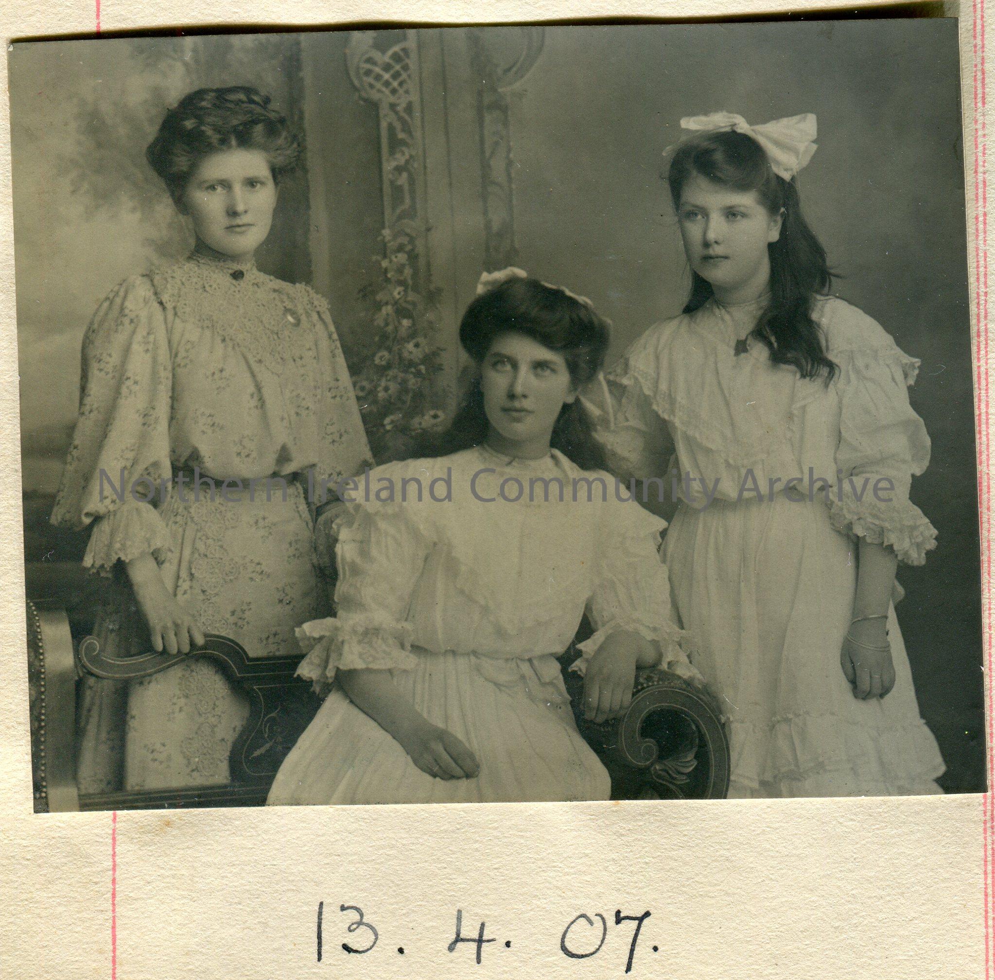 Black and white portrait photograph of three young women in Victorian style dress. Dated in handwriting as 13.4.07.
