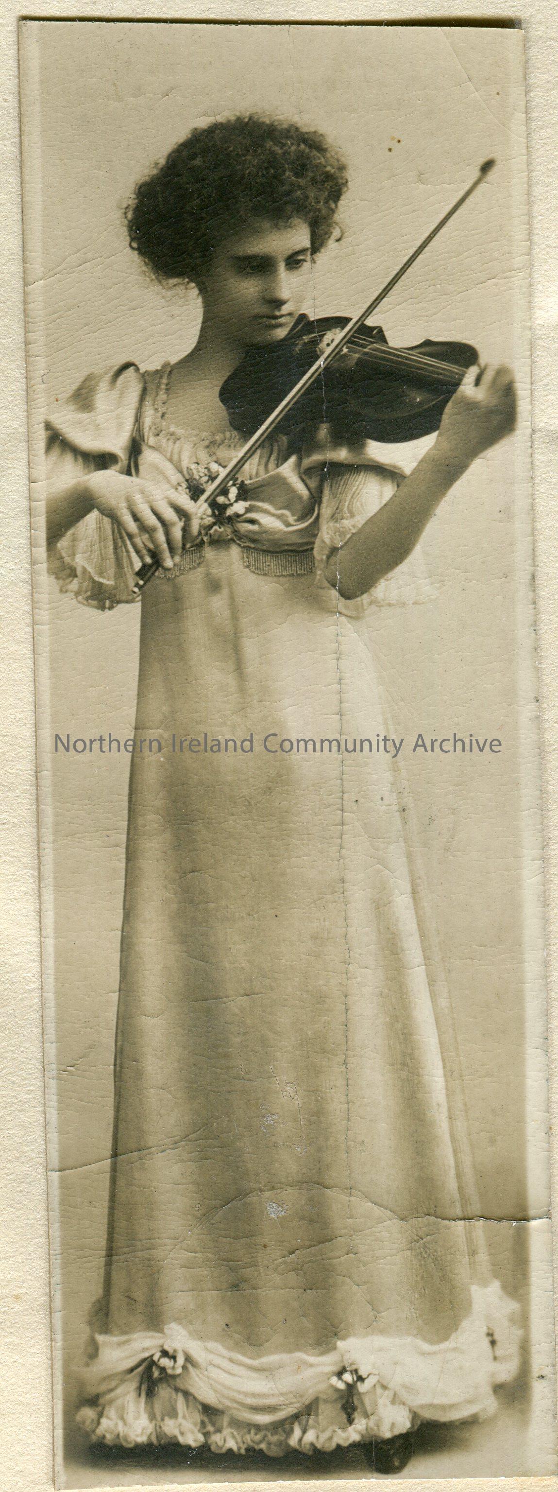 Black and white portrait photograph which appears to have been cut out. Features a young woman playing the violin.