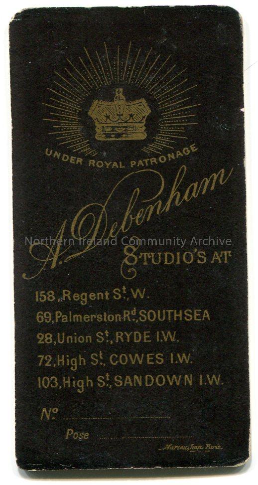 Black and white portrait style photographic image mounted onto a small, round edged card of a woman in Victorian style dress with her face to one side. Printed on the back is 'Under Royal Patronage. A. Debenham Studio's At' Regent Street, Southsea, Ryde, Cowes and Sandown. The number 020956 is handwritten in pencil. 'Marion T?, Paris' printed in small writing at bottom of card on reverse side.