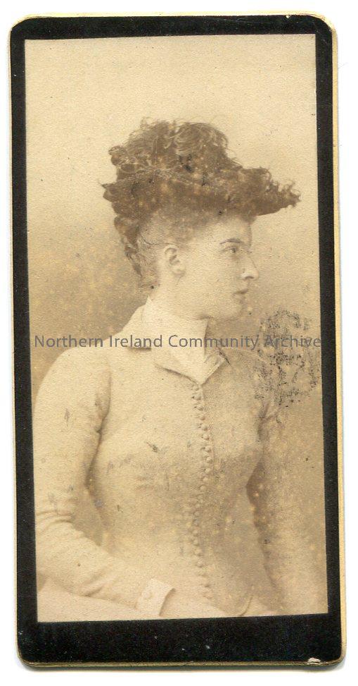 Black and white portrait style photographic image mounted onto a small, round edged card of a woman in Victorian style dress with her face to one side…
