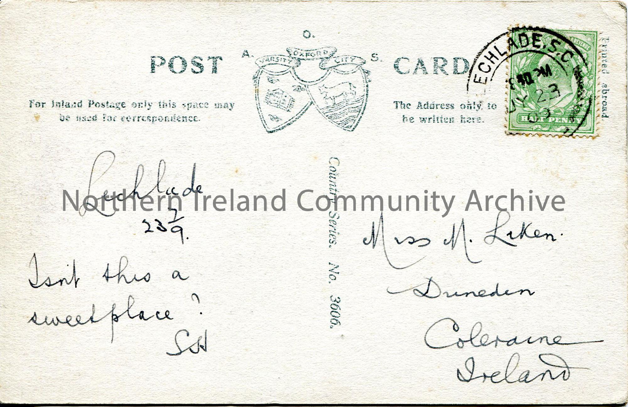 Black and white postcard of Little Faringdon Mill featuring houses and a river. Addressed to Miss M[aimie]. Liken, Dunedin, Coleraine, Ireland. From S… – scan013b