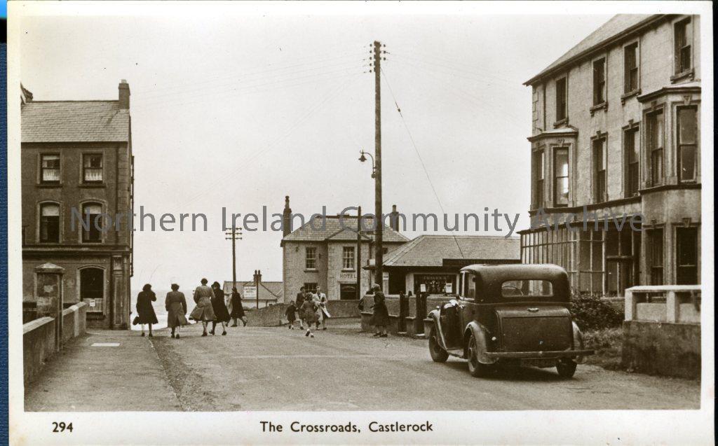 Black and white postcard of The Crossroads, Castlerock, circa 1950 – 1960. M & L National Series, number 294. (6629)