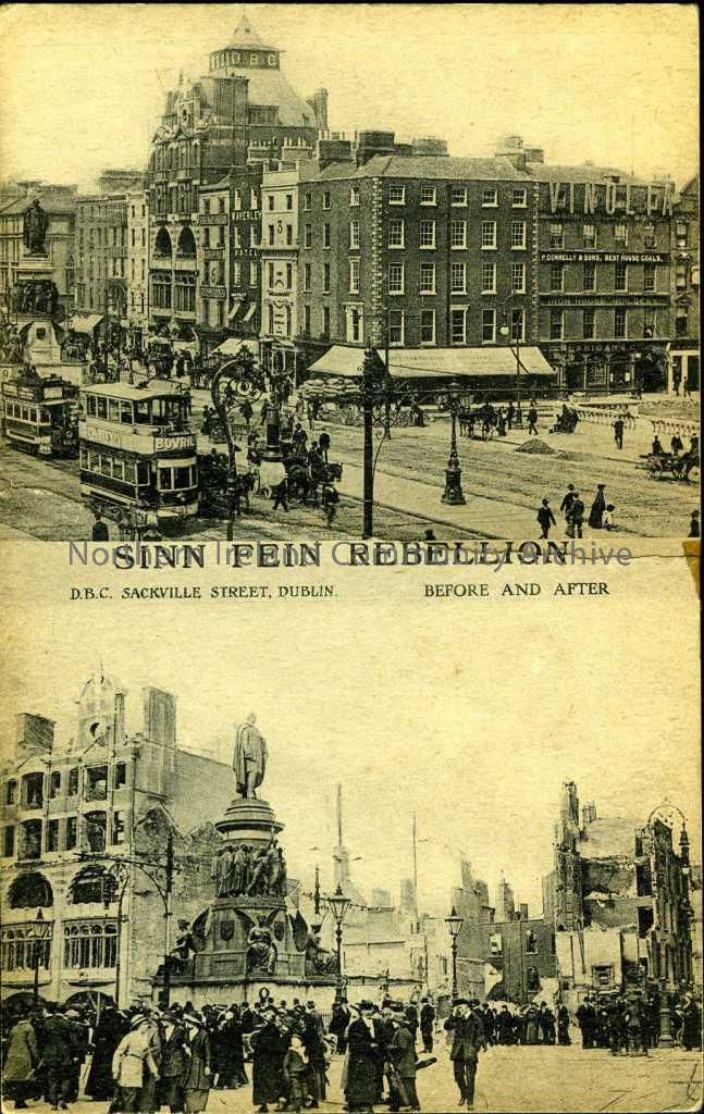 Black and white postcard split into two halves with two different images. Text inbetween the images reads ‘Sinn Fein Rebellion D.B.C Sackville Street,…