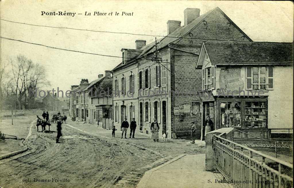 Black and white postcard titled ‘Pont-Remy – La Place et le Pont’. Dated 26.12.1920 on the reverse and there is a handwritten message in French.