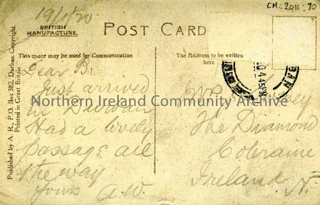 Black and white postcard, titled ‘Ricksha Boys, S.A’. Dated on the reverse 19.1.1920 and addressed to Mrs Sweeney, The Diamond, Coleraine, Ireland. Si… – 0016