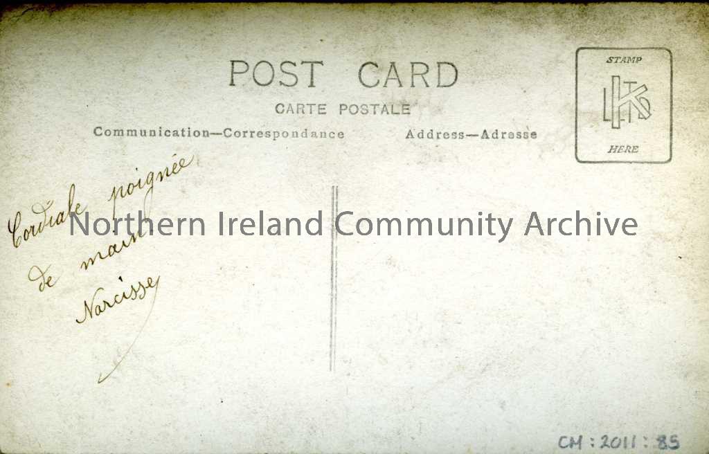 Black and white postcard with four horses pulling farming machinery which a man sits on. Handwritten message in French on the reverse. Same as CM:2011:84 apart from different message on the reverse in French.