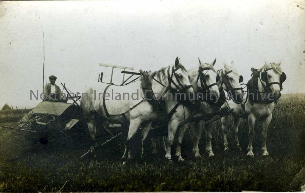 Black and white postcard with four horses pulling farming machinery which a man sits on. Handwritten message in French on the reverse.