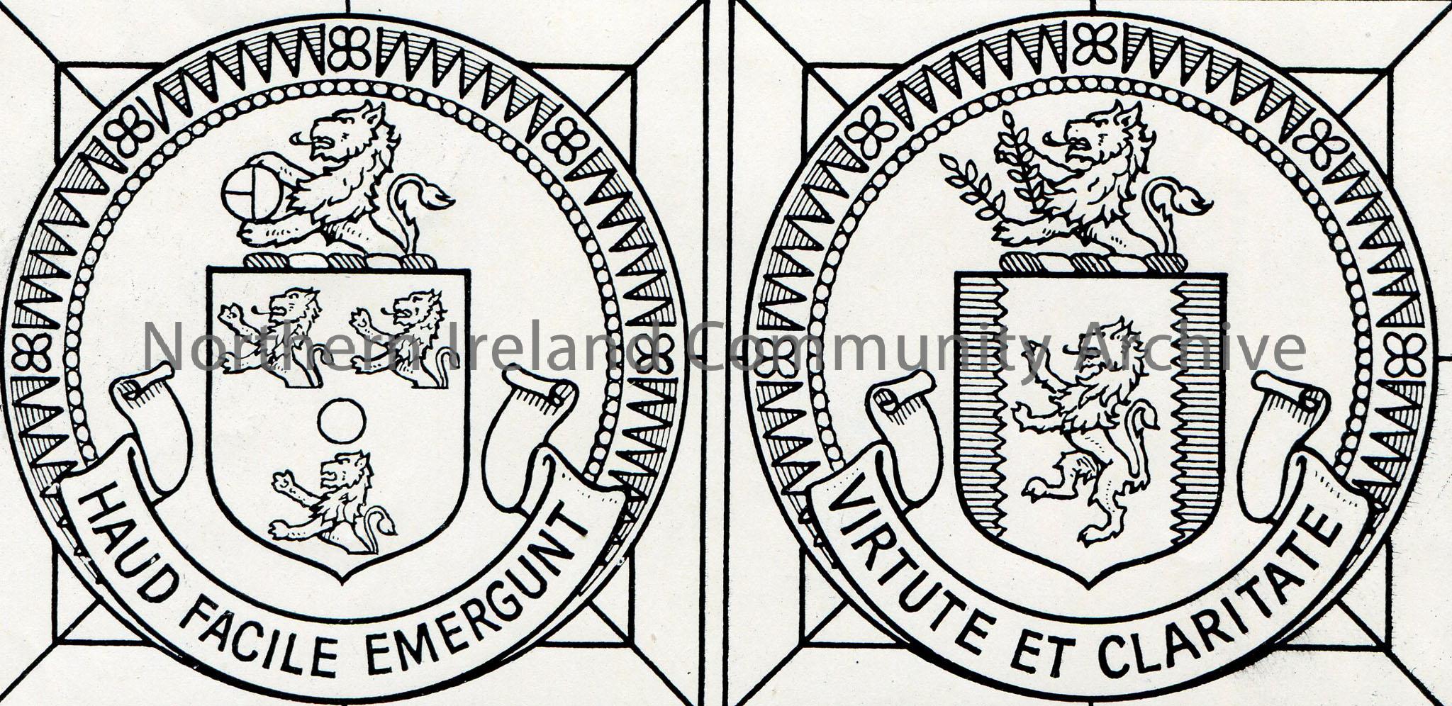 Black and white print of two coats of arms. They read 'Haud Facile Emergunt' [They Do Easily Rise. Possibly of the Bennett family name] and 'Virtute et Claritate' [By Virtue and Renown]. Both feature lions.