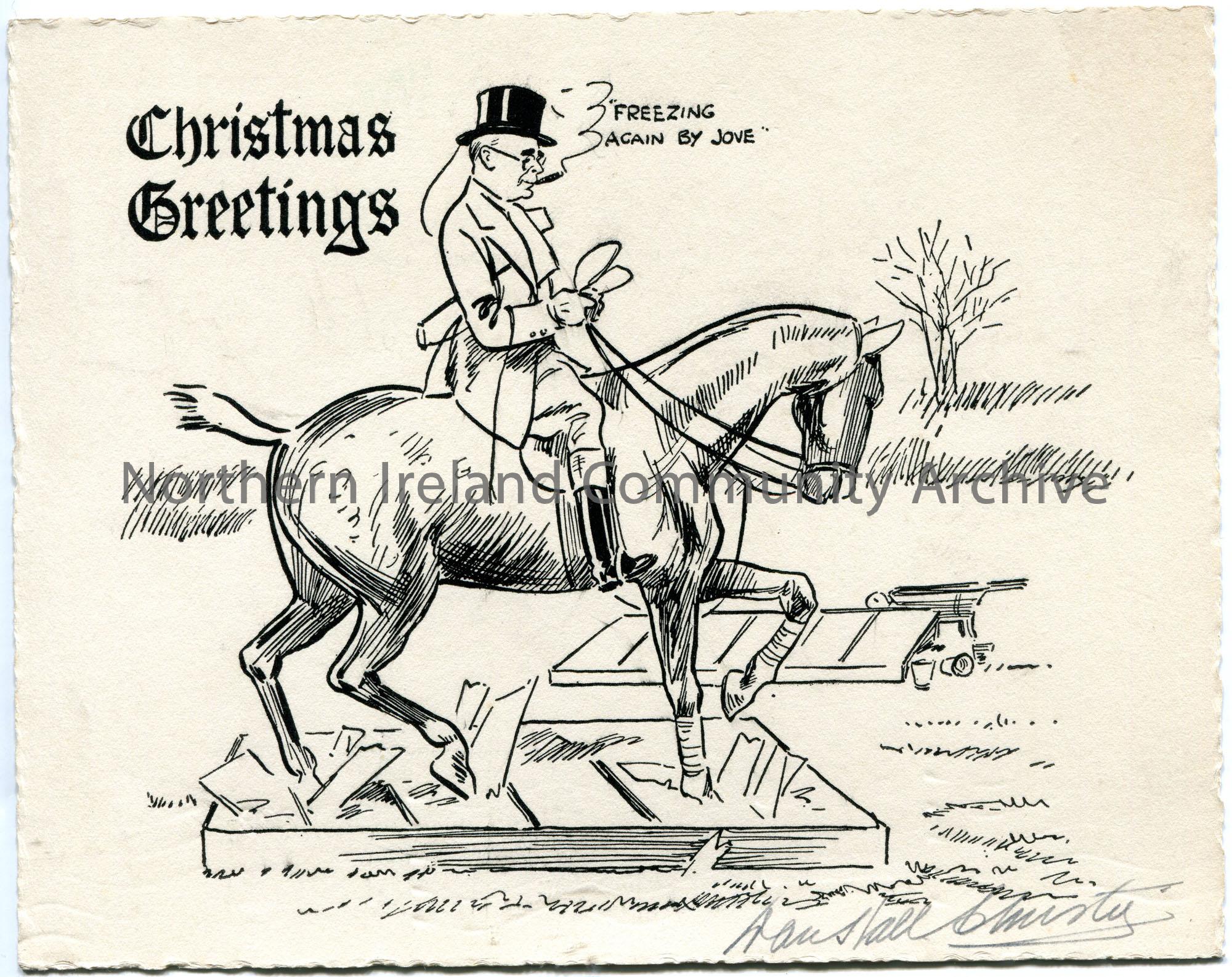 Black and white printed Christmas greetings card. Features a well dressed man on horseback smoking a cigar. Captioned, ‘Freezing Again By Jove’. Signe…