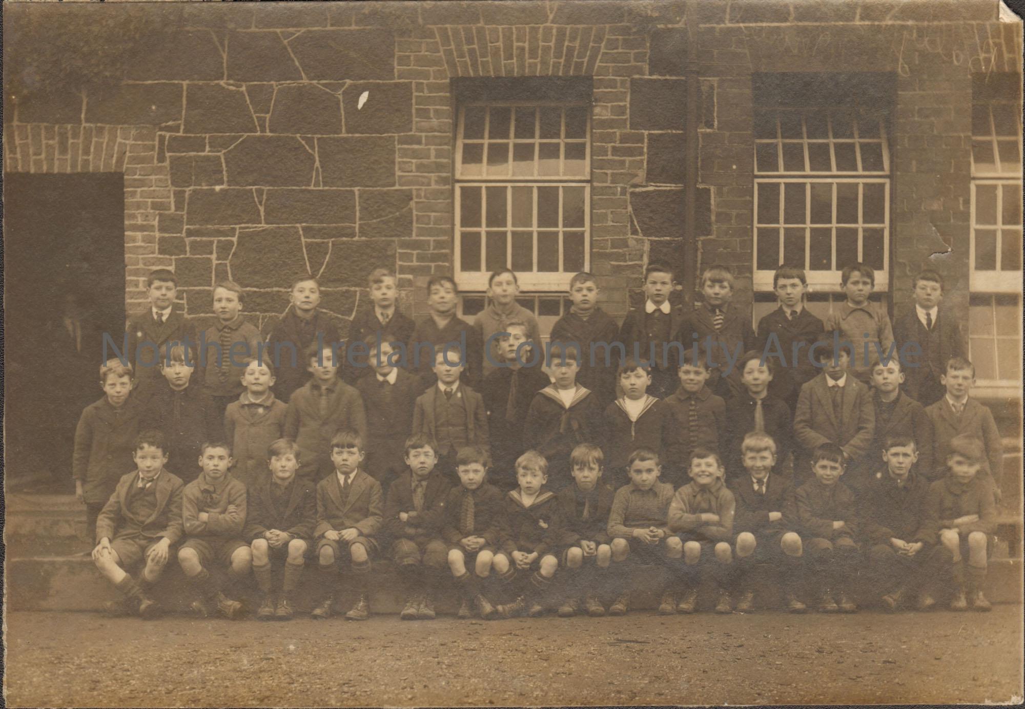 Black and white school photograph, Model School. 3 rows of children in front of a building.