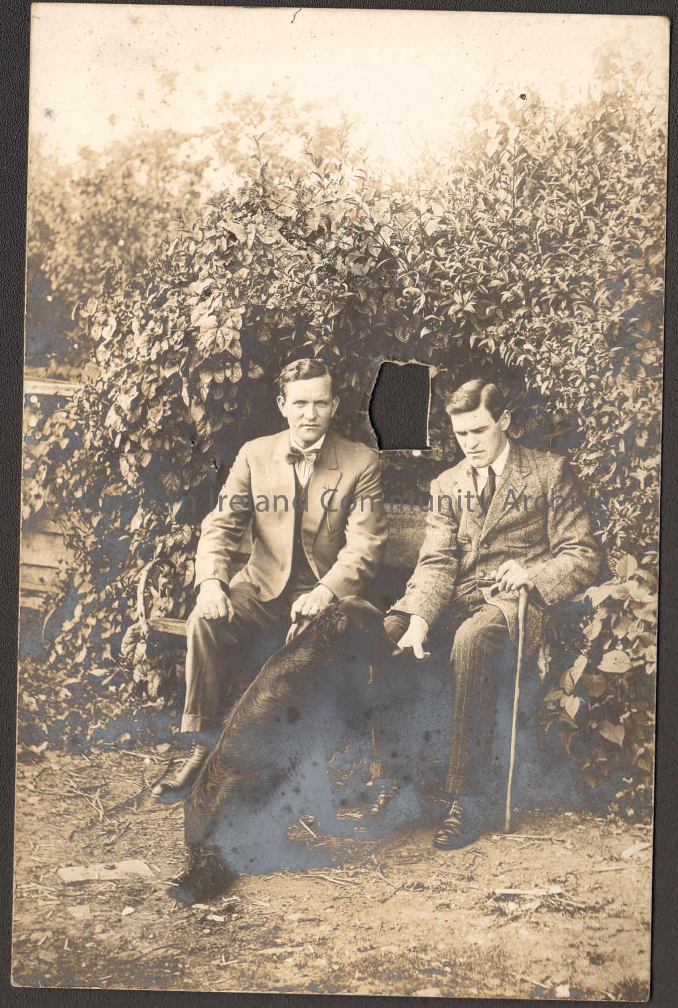 Black and white school photograph of two men sitting in a garden with a dog. On right, George Shiels.