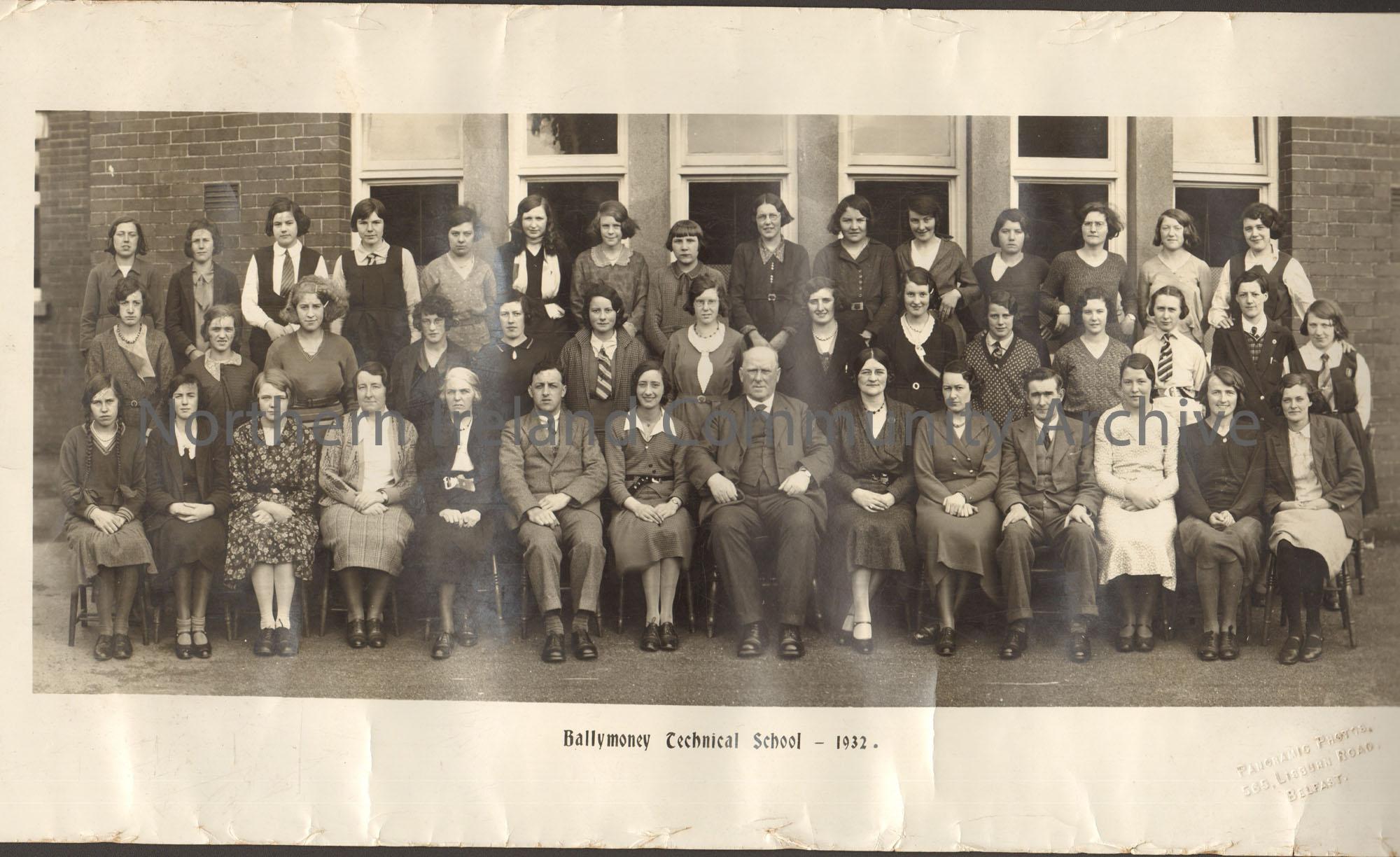 Black and white school photograph with white border. Students (all girls not in uniform) and their teachers sitting in front of a building with six windows. Ballymoney Technical School 1932