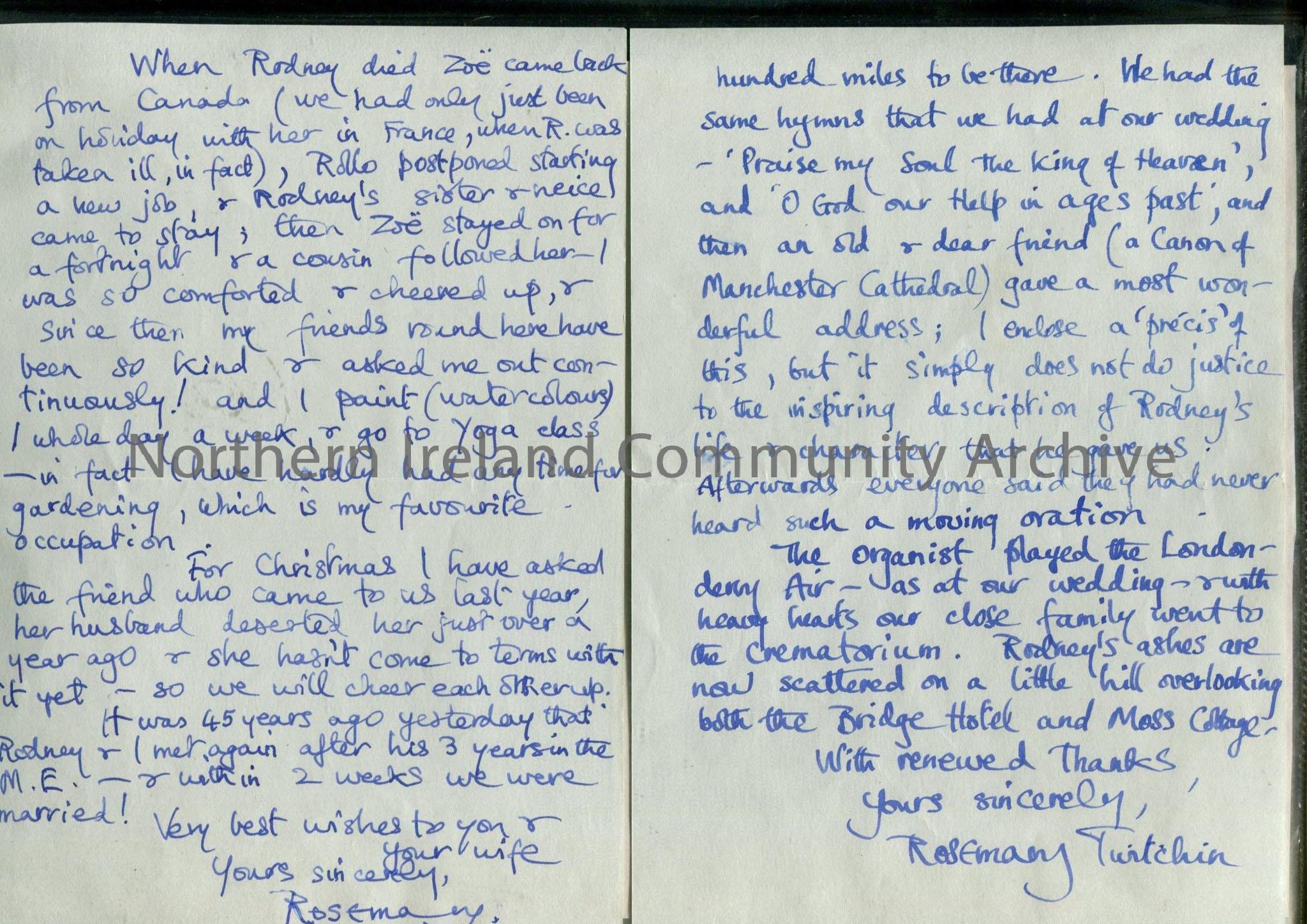 Black booklet with two letters on blue paper from Rosemary Twitcham to "Dick" and "Mr Pringle." Also is typed speech remembering Rodney Twitcham 1915-1988 by Gwilym Morgan.