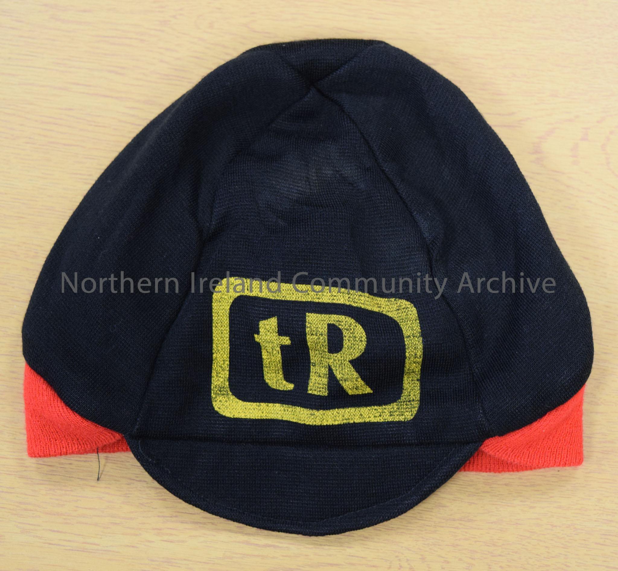 Black cap with red elasticated rim. Yellow letters “tR” inside a yellow frame on the front above the peak.