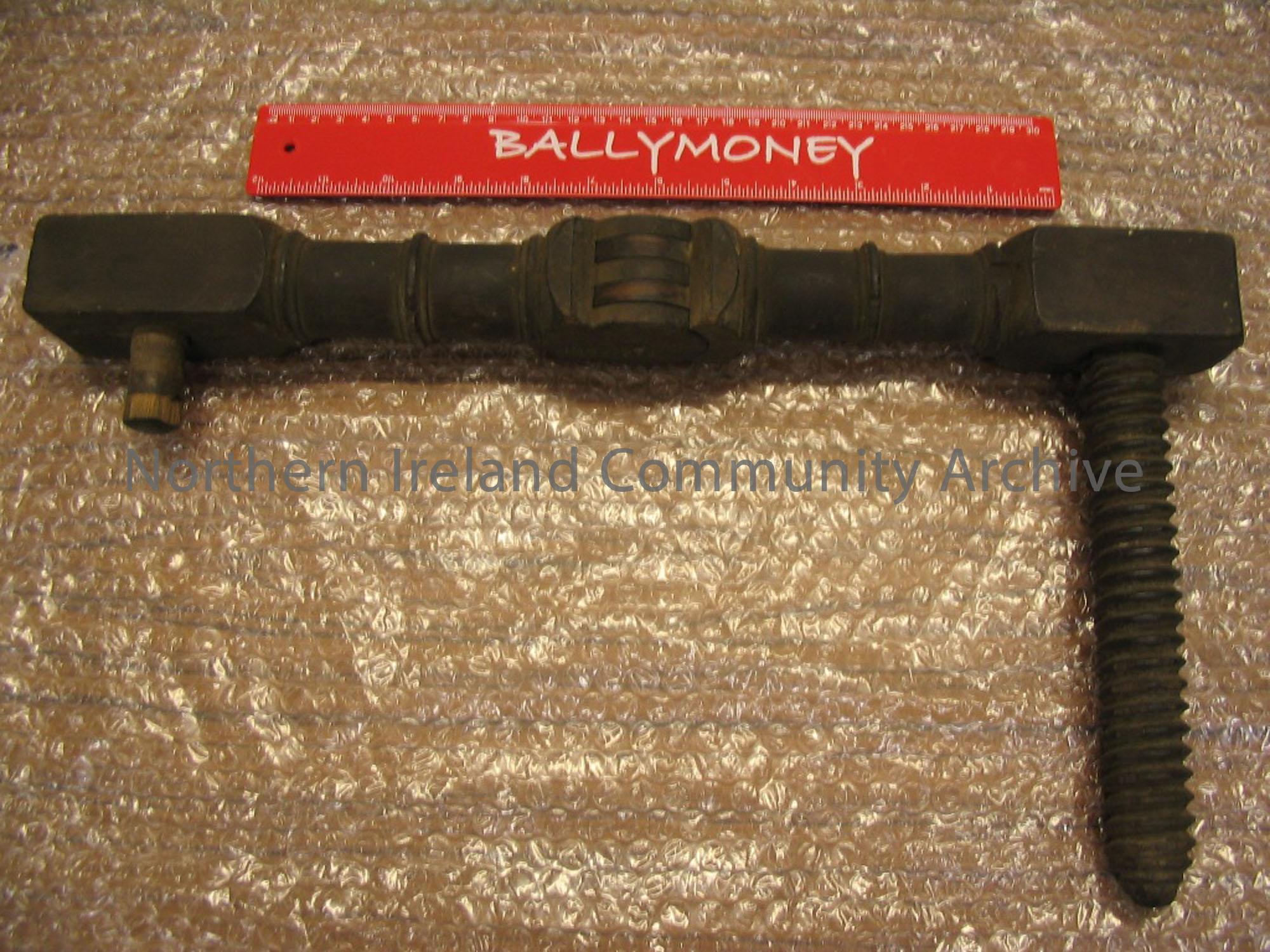 Black coloured,turned wooden arm hinged at the centre with a large wooden screw perpendicular to the arm.
