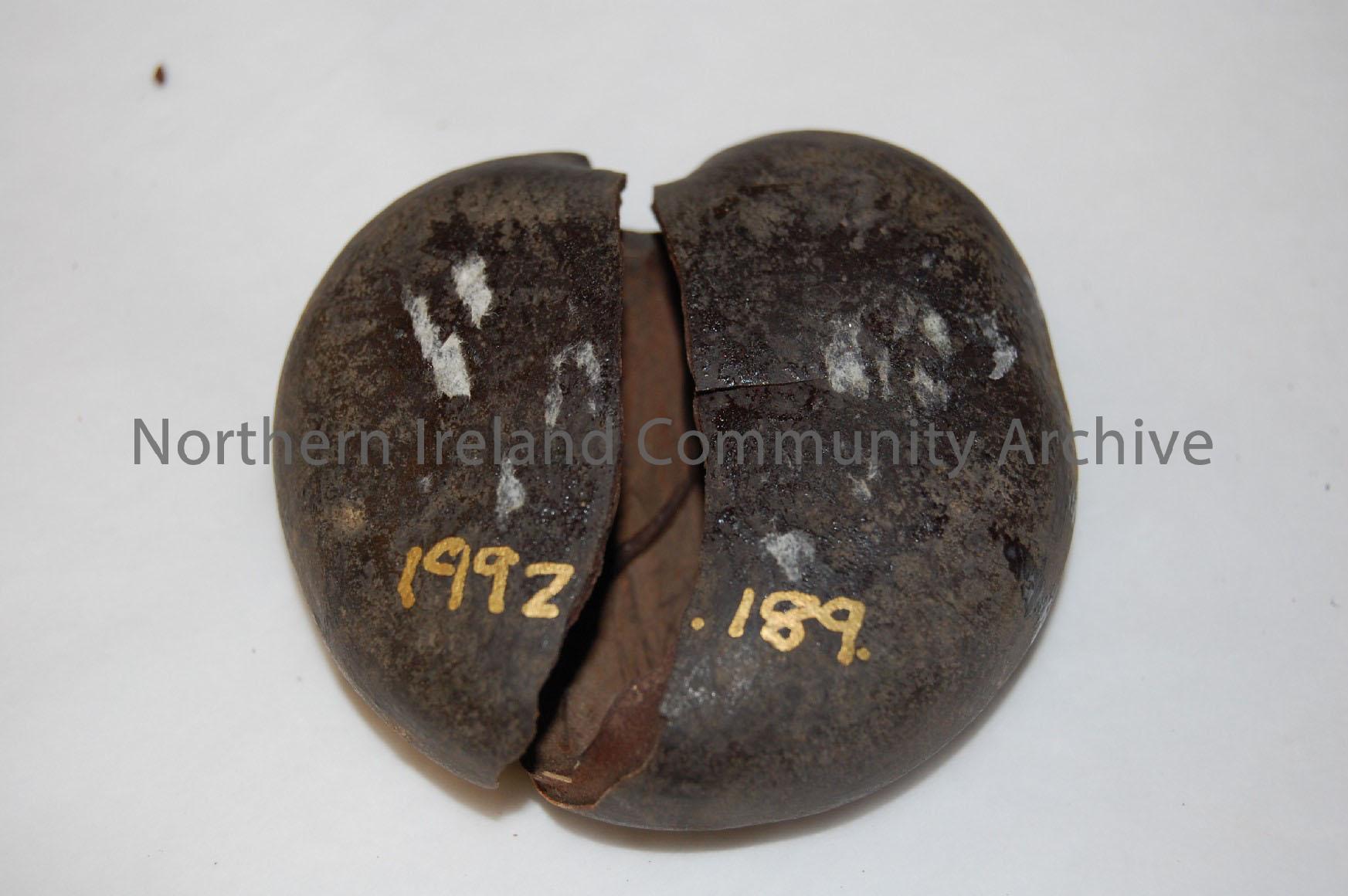 Black heart shaped container broken in two pieces. Possibly a snuff box – 1992.189