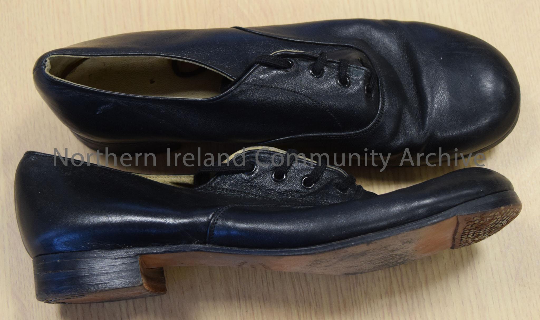 Black leather Irish Dancing shoes. Sometimes known as jig or hard shoes. Belonged to Jean Tennant.