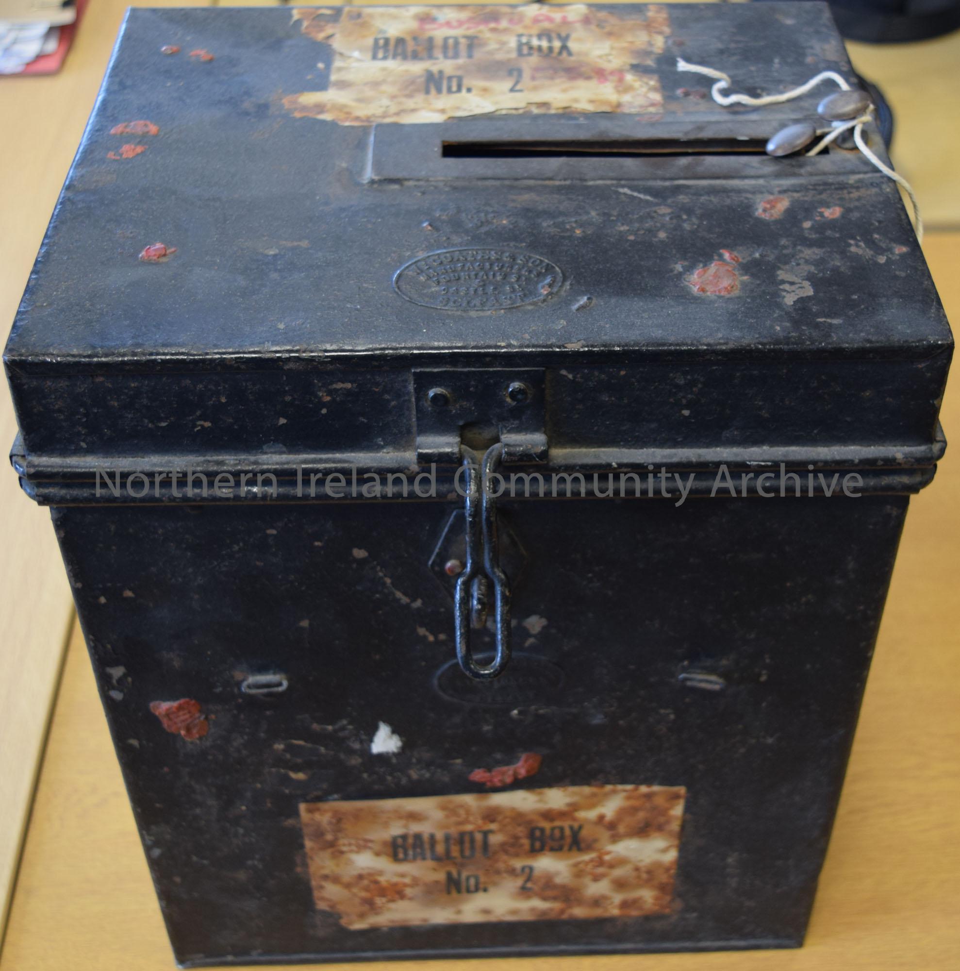 Black metal ballot box with slit on top to insert ballots. Two handles, one on each side. Stamp on top and front of box with inscription 'Coates & Son, Manufacturers Fountain St & Castle St Belfast. Sticker on front and top stating Ballot Box No. 2. Sticker on inside of lip stating District Electoral Division of Dunlop.